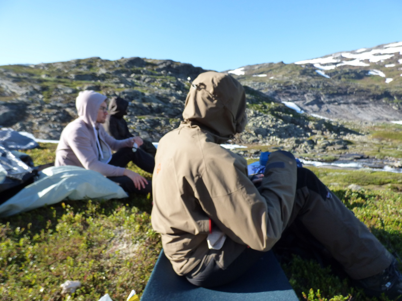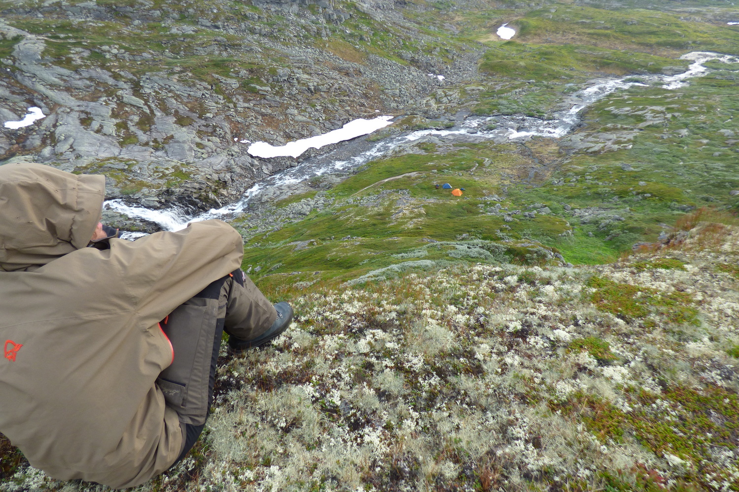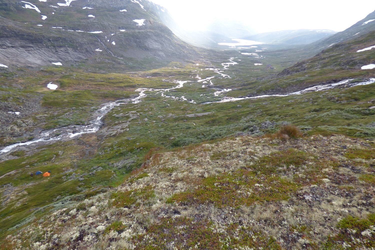 TIllbaka från toppen var det dags att äta innan vi började fälla tält och packa ihop. Vi hade en lång dag framför oss fortfarande. Vi bröt upp från vårt camp och gick med full packning igen. Det är definitivt tyngre med stor ryggsäck och då är ett tempo med lagom korta vilopauser på 5-10 minuter per timma är vad som brukar funka bra. Landskapet ledde vidare mot en fjällsjö, Lonavatnet där det gick får på bete intill en bäck. En väldigt harmonisk miljö.