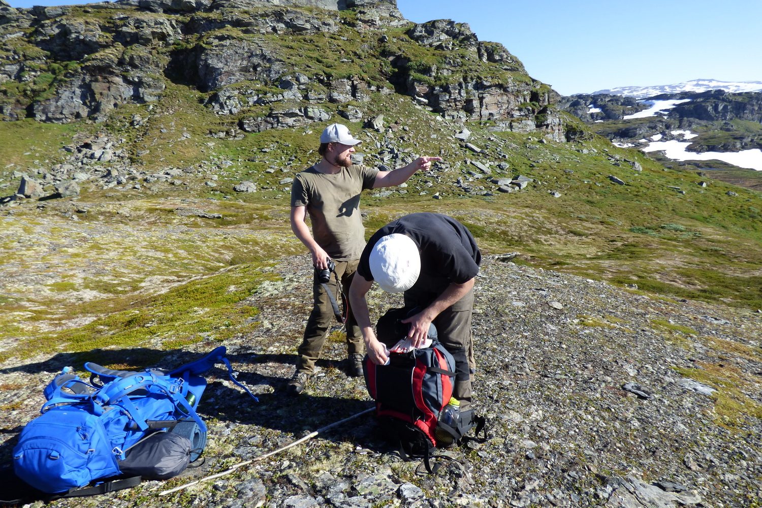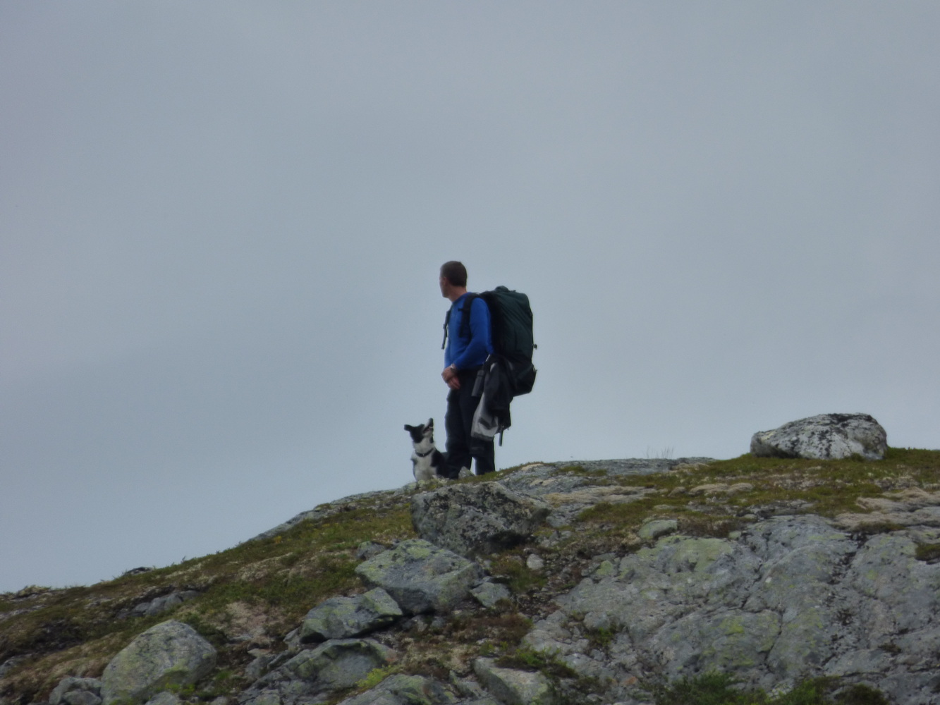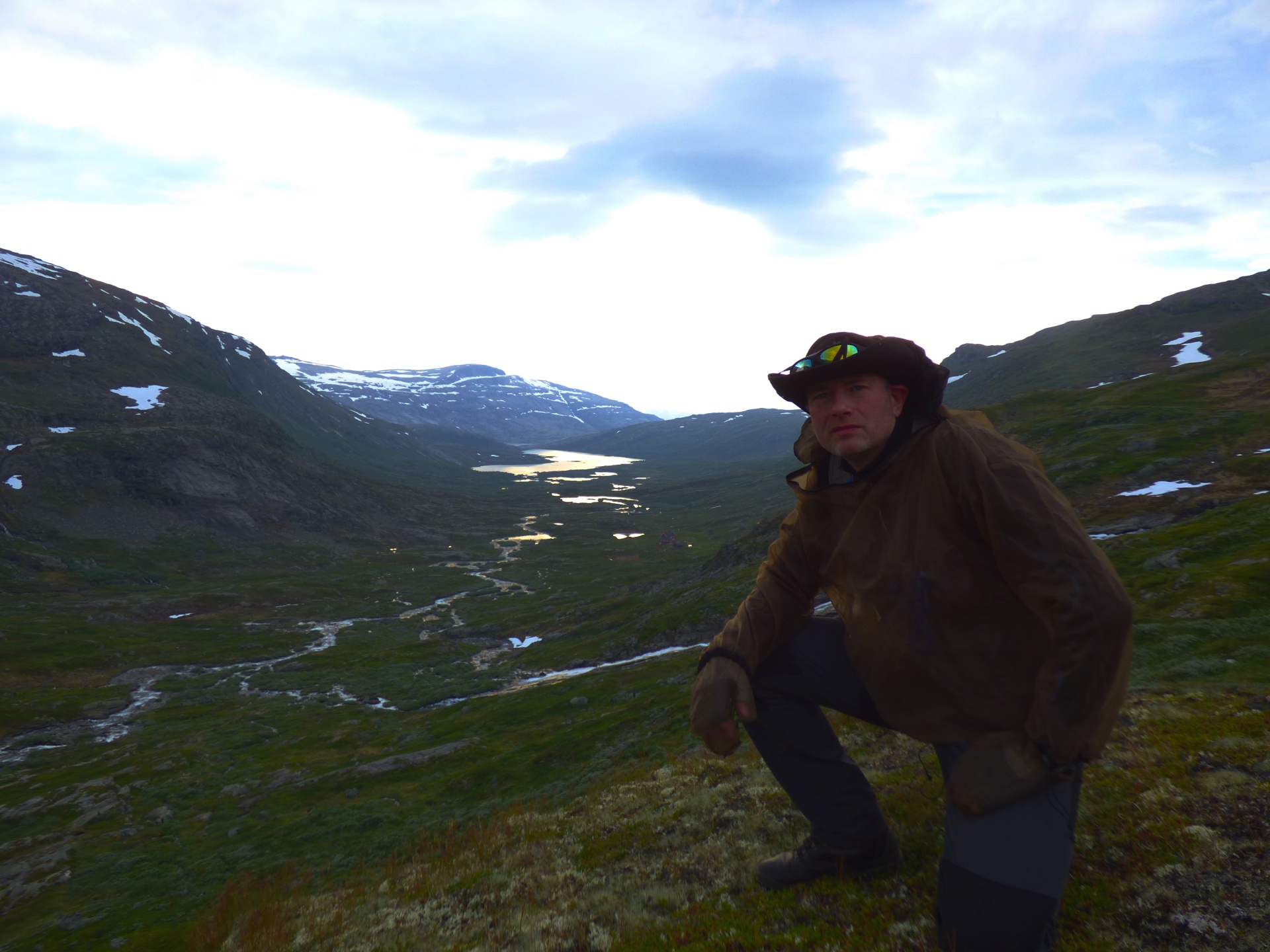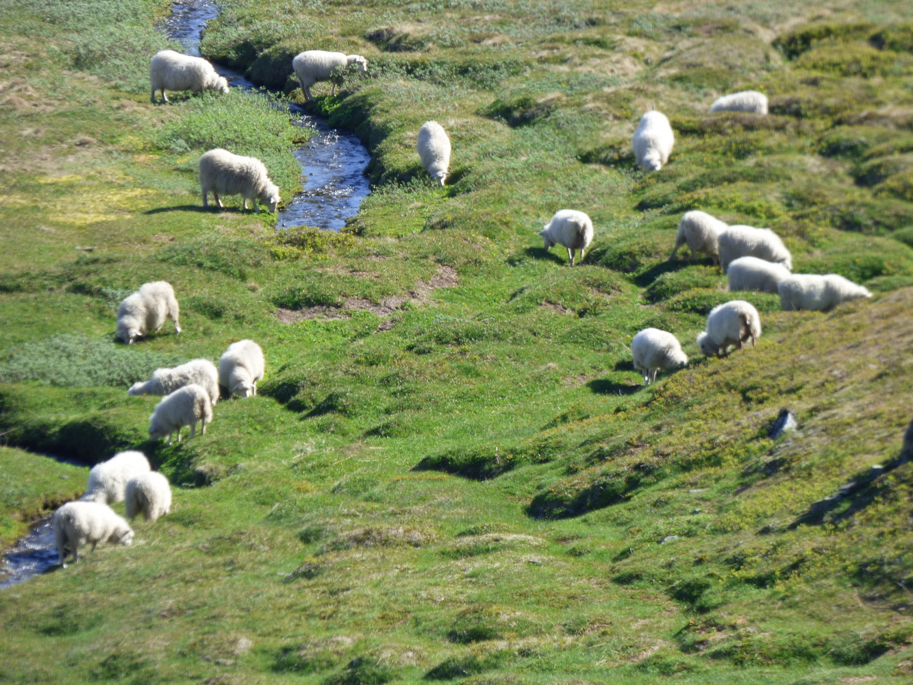 TIllbaka från toppen var det dags att äta innan vi började fälla tält och packa ihop. Vi hade en lång dag framför oss fortfarande. Vi bröt upp från vårt camp och gick med full packning igen. Det är definitivt tyngre med stor ryggsäck och då är ett tempo med lagom korta vilopauser på 5-10 minuter per timma är vad som brukar funka bra. Landskapet ledde vidare mot en fjällsjö, Lonavatnet där det gick får på bete intill en bäck. En väldigt harmonisk miljö.