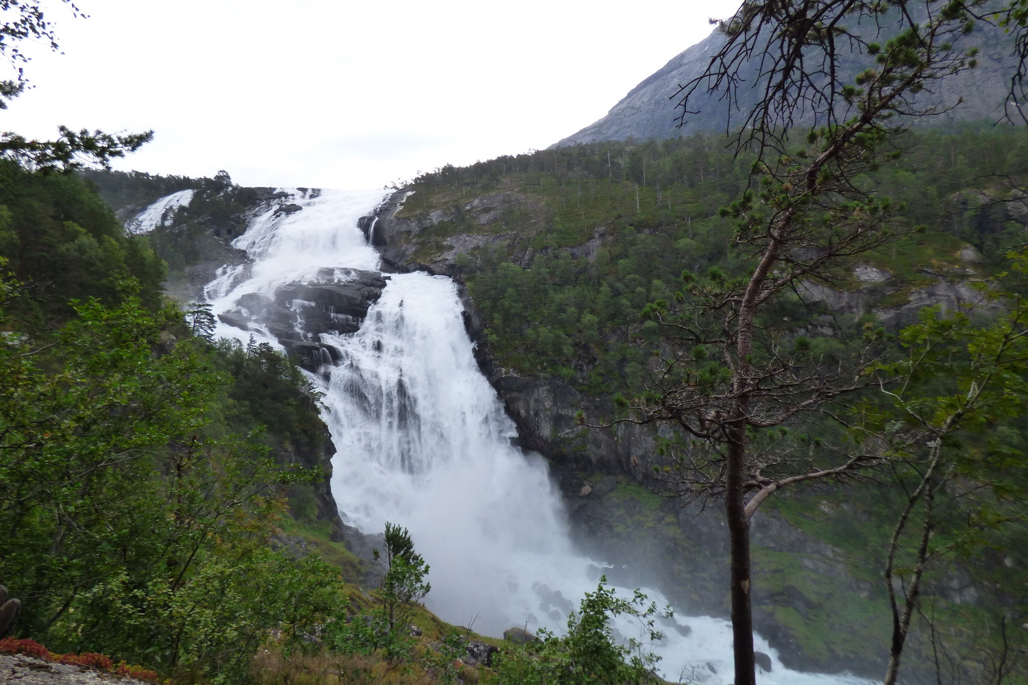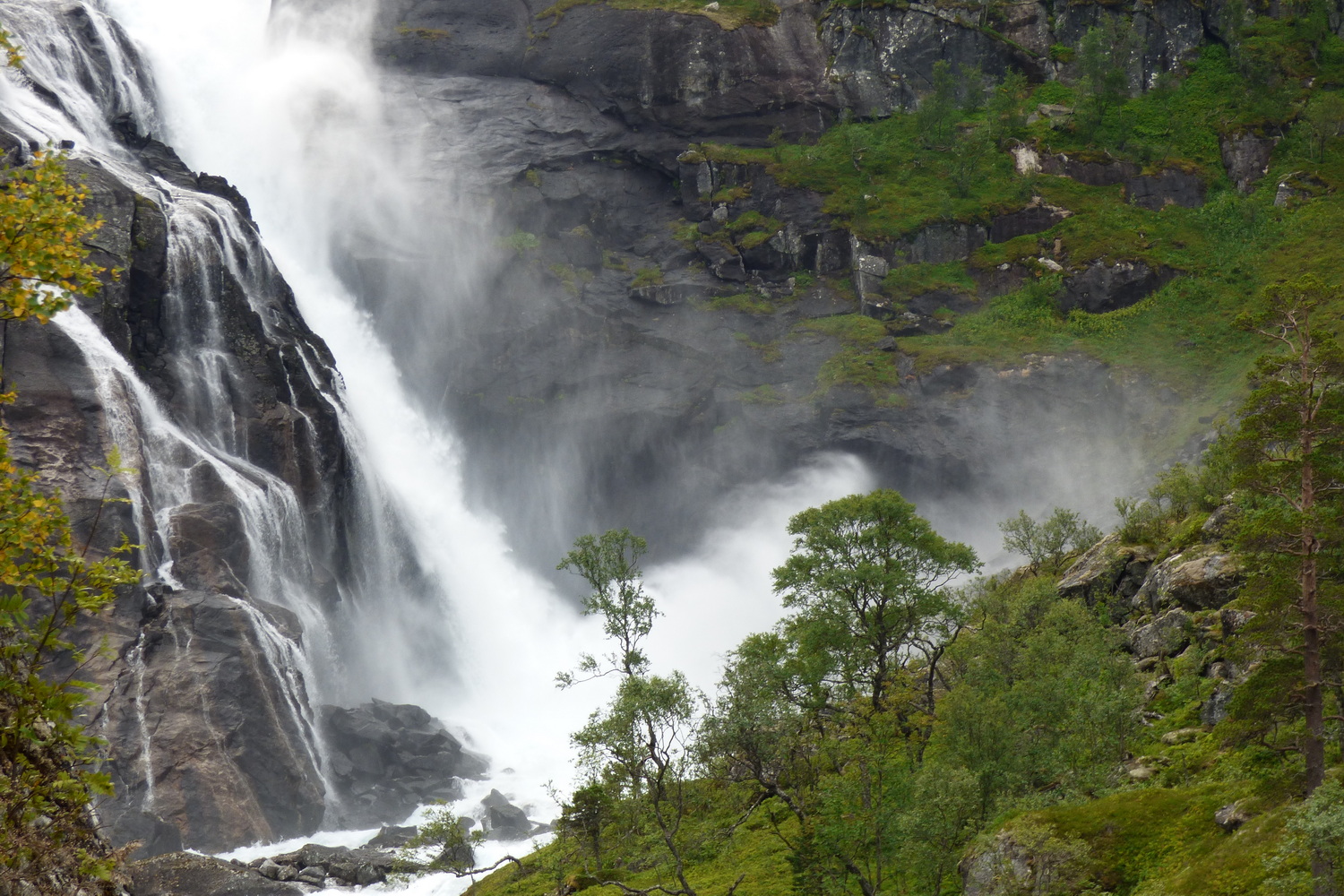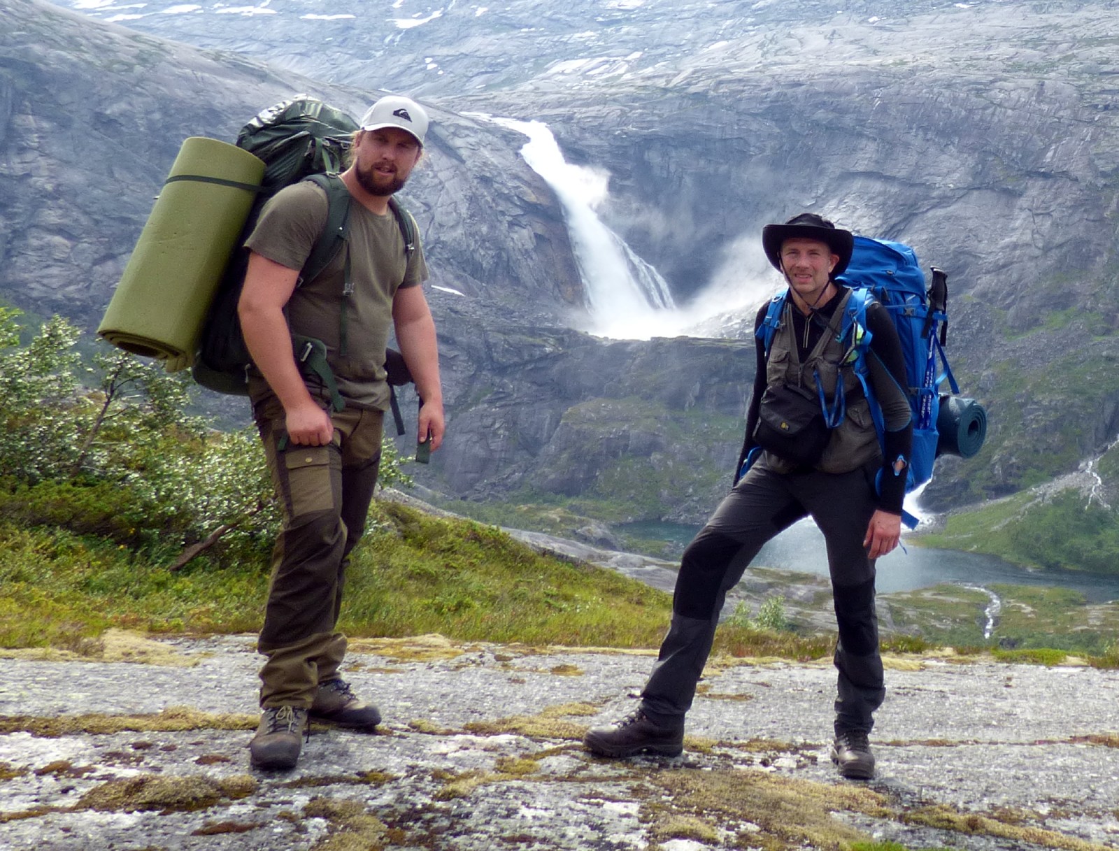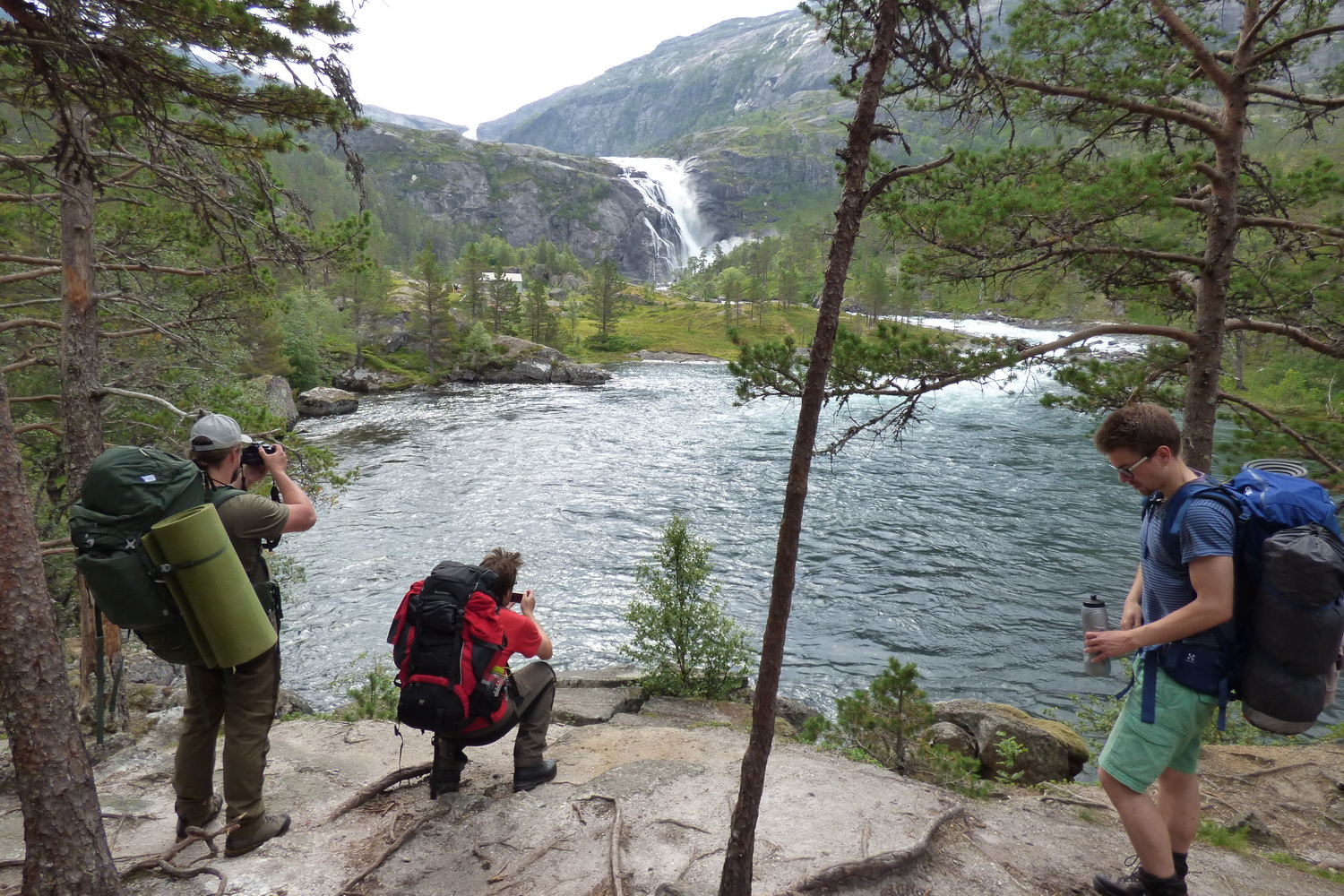 Vi parkerade lite ovanför det lilla samhället Kinsarvik där vår tur skulle starta. Tanken var att hinna turen på två dagars vandring och jag hade även planerat en topptur till en bergstopp utmed rutten om allt gick som det var tänkt. Vi såg att det var en del aktivitet och andra vandrare som gjorde sig redo att gå upp på fjället denna helg och antagligen är Turisthyttan Stavali en populär plats. Vi hade tänkt vandra vidare från hyttan och tälta på fjället. Den första biten upp från parkeringen var brant och det dröjde inte länge innan forsen och vattenfallen dök upp. Det var en mäktig syn att se på medan vi fyllde våra vattenflaskor i det kristallklara vattnet.