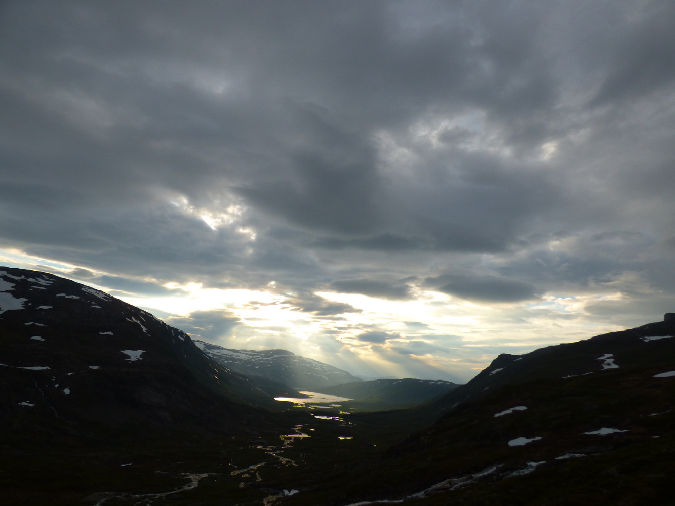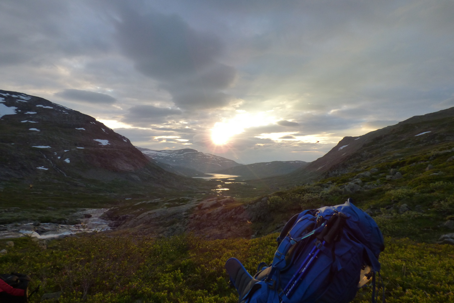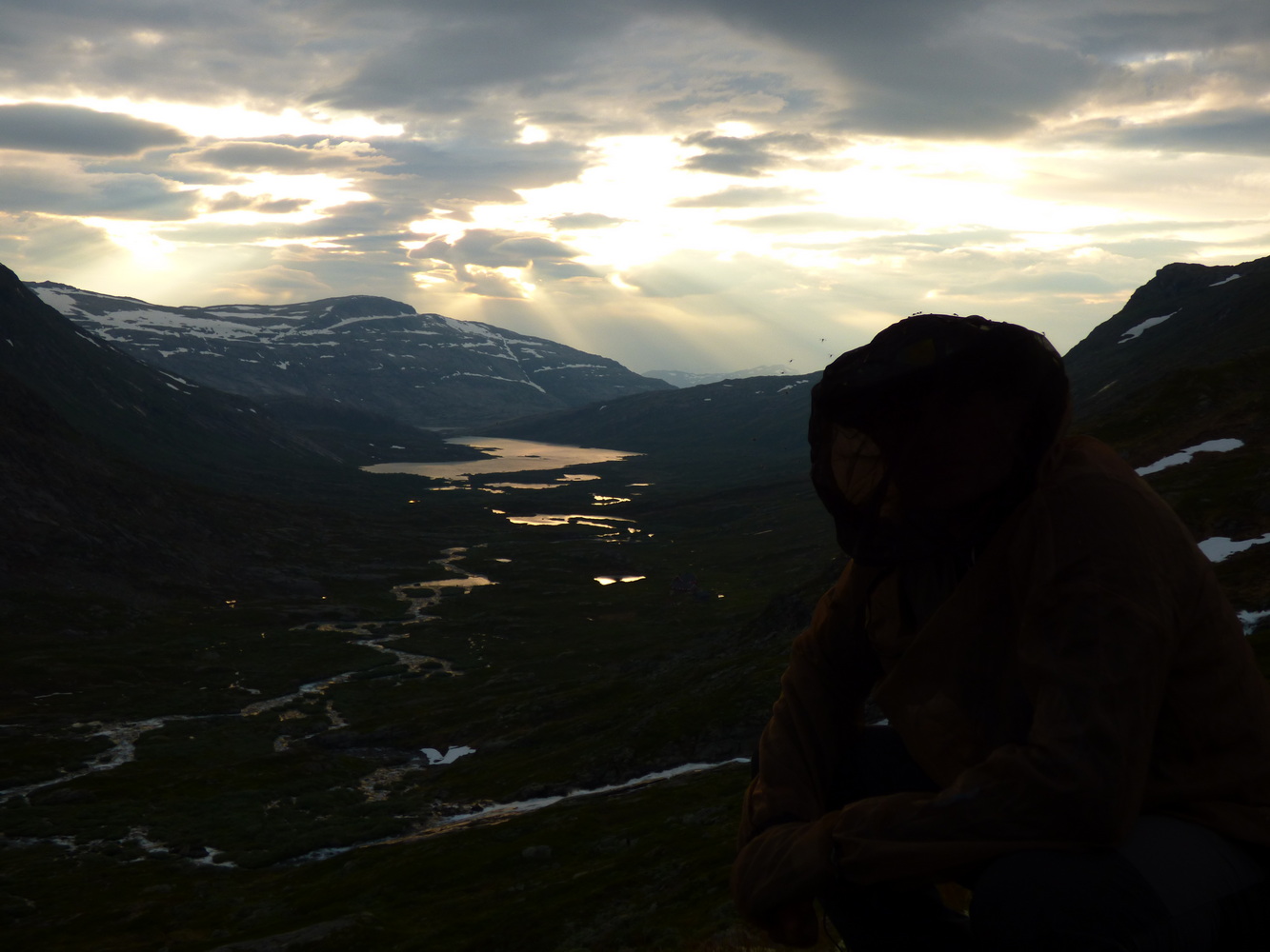 Vi slog upp våra tält en bra bit ifrån fjällstation vi passerat tidigare och det kändes väldigt lugnt och skönt att gå upp något hundratal meter för att njuta av det öppna landskapet och se hur kvällssolen spred ett guldskimmer över vattendragen genom det dramatiska molntäcket. Hade det inte varit för myggen som är extra ivriga sådana här lugna kvällar så sfanns det inte något att klaga på. Men jag hade min myggtröja av mesh-nät och lät mig inte störas av surret från myggorna.