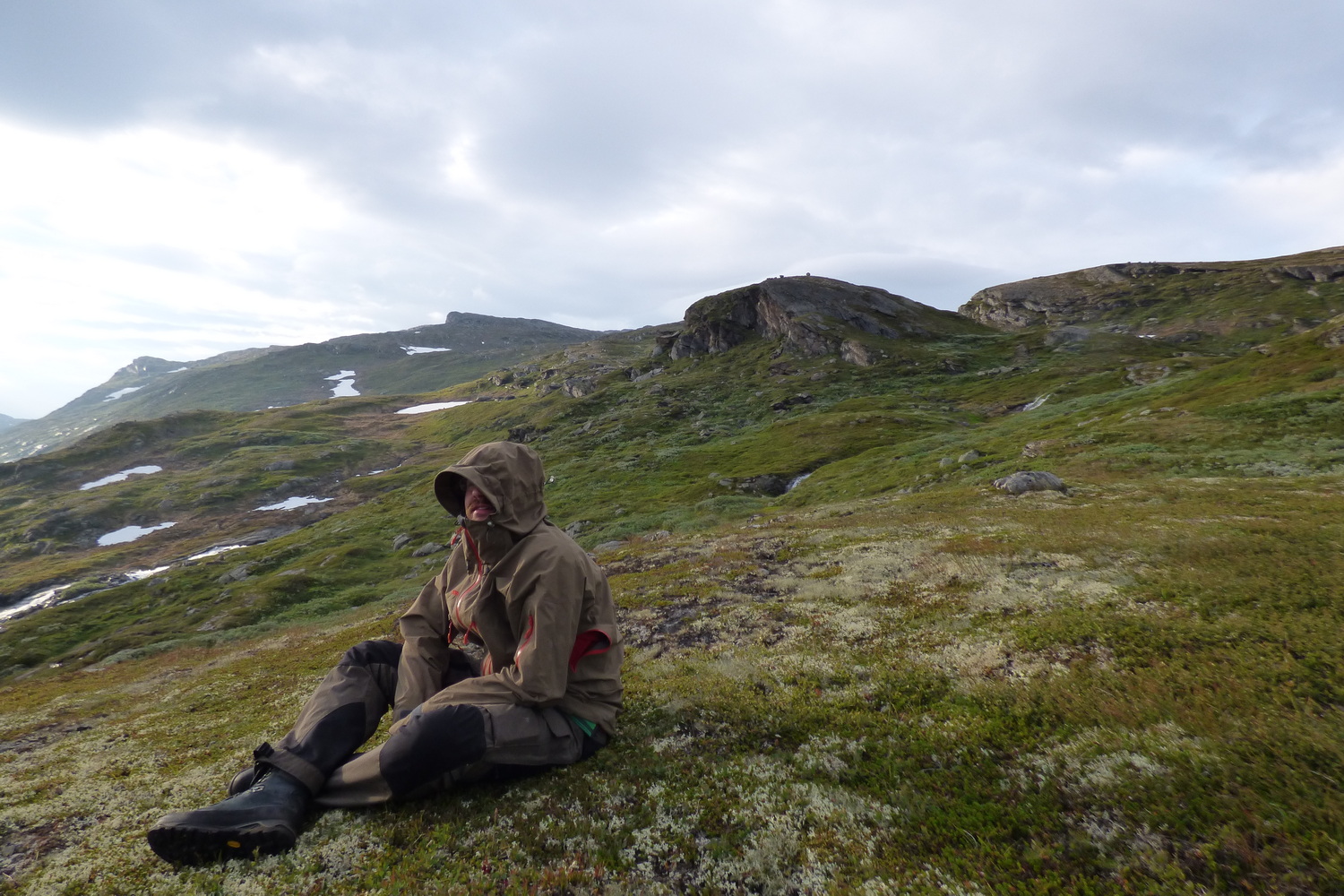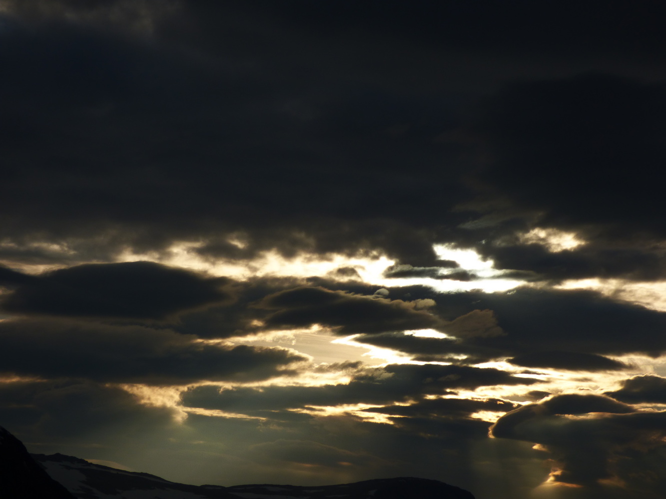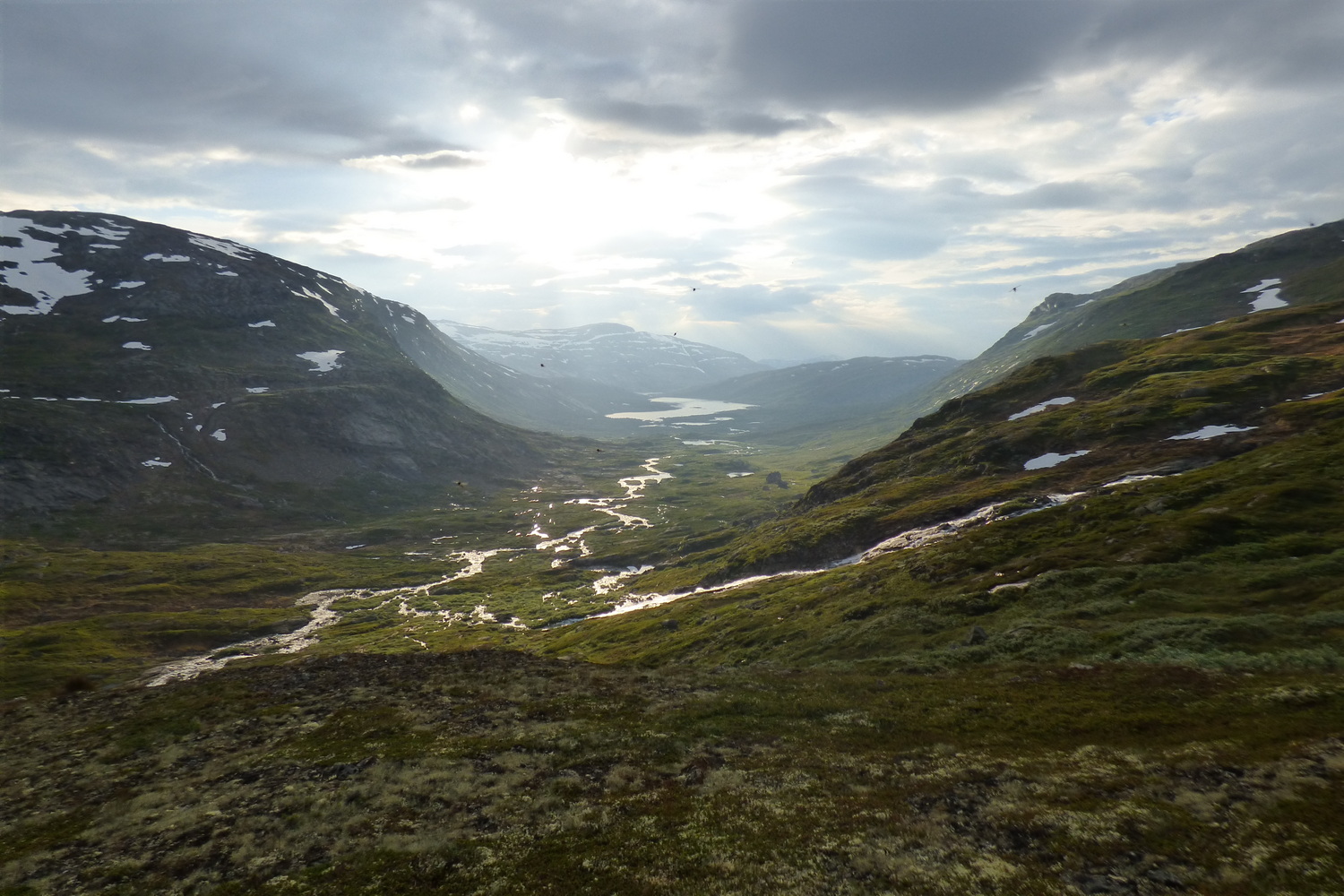 Vi slog upp våra tält en bra bit ifrån fjällstation vi passerat tidigare och det kändes väldigt lugnt och skönt att gå upp något hundratal meter för att njuta av det öppna landskapet och se hur kvällssolen spred ett guldskimmer över vattendragen genom det dramatiska molntäcket. Hade det inte varit för myggen som är extra ivriga sådana här lugna kvällar så sfanns det inte något att klaga på. Men jag hade min myggtröja av mesh-nät och lät mig inte störas av surret från myggorna.