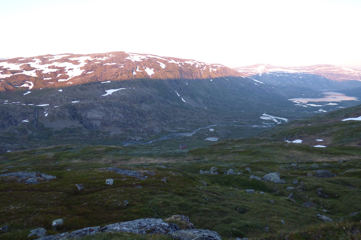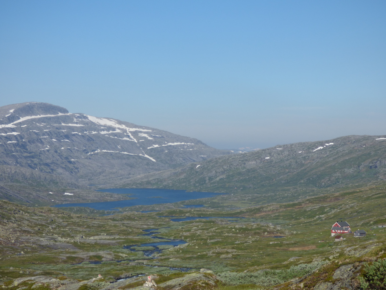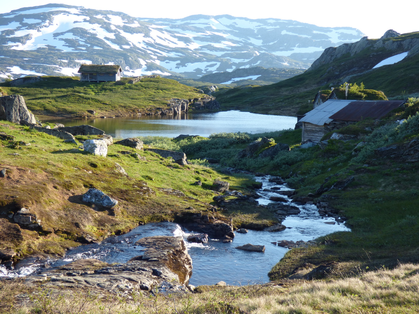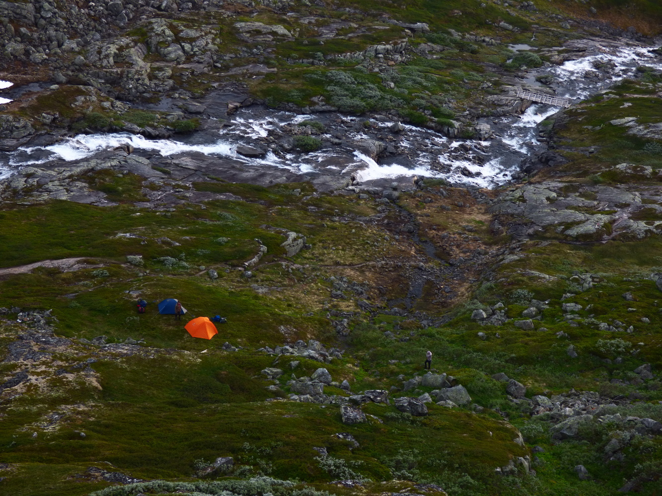 Efter flera vattenfall och en hel del stigning så kom vi sakta upp i dalen som leder in till Hardangervidderna och passerade också Turisthyttan Stavli på vår väg fram mot kvällens tältplats. Det låg några äldre stenhus i närheten av hyttan och där fanns också en utomhuspool i anslutning. Poolen skulle komma att bli välbesökt, vilket jag såg från långt håll när jag zoomade in på den från vårt läger några kilometer längre bort senare på kvällen.