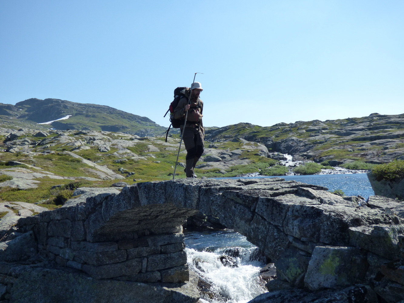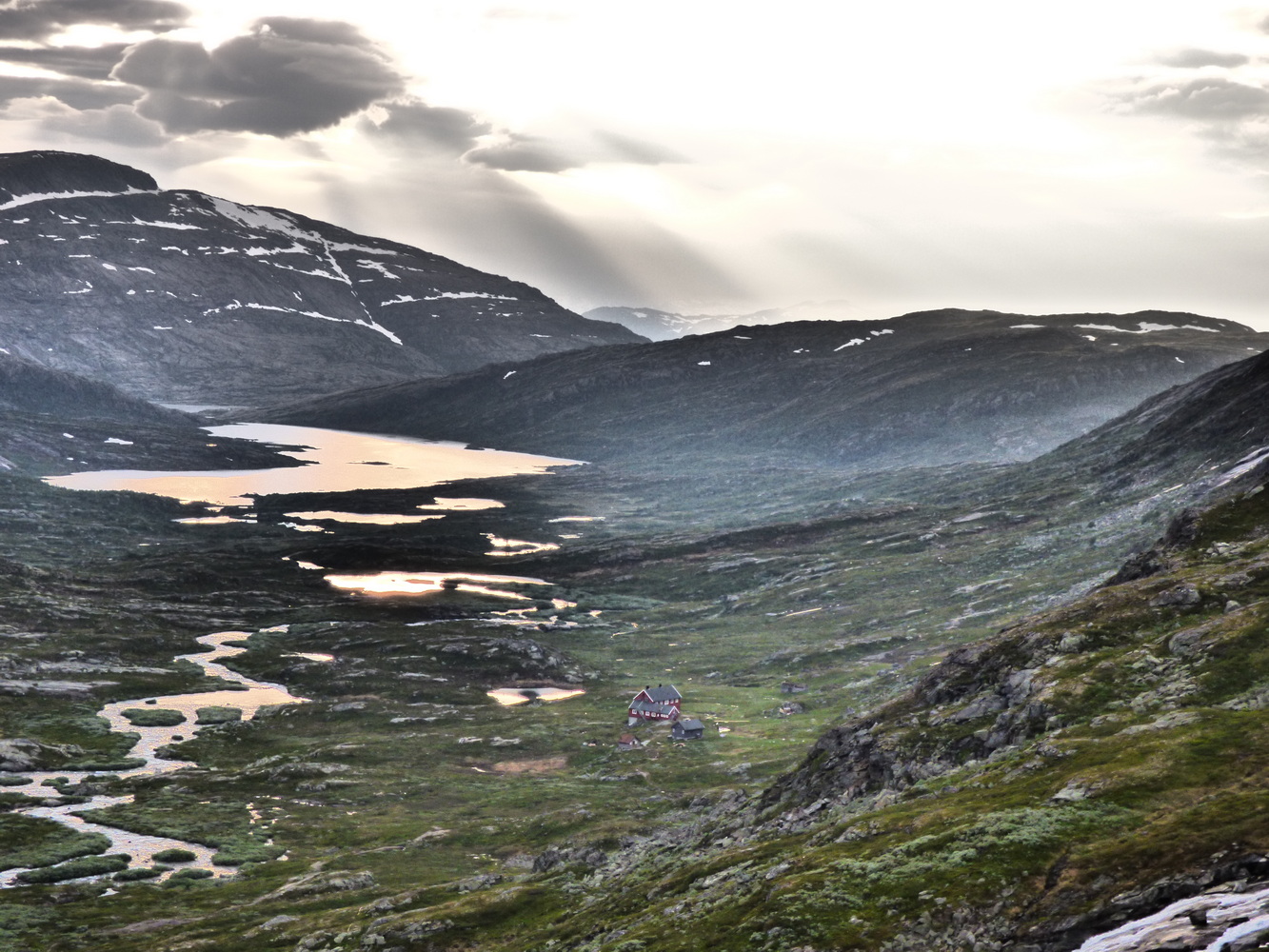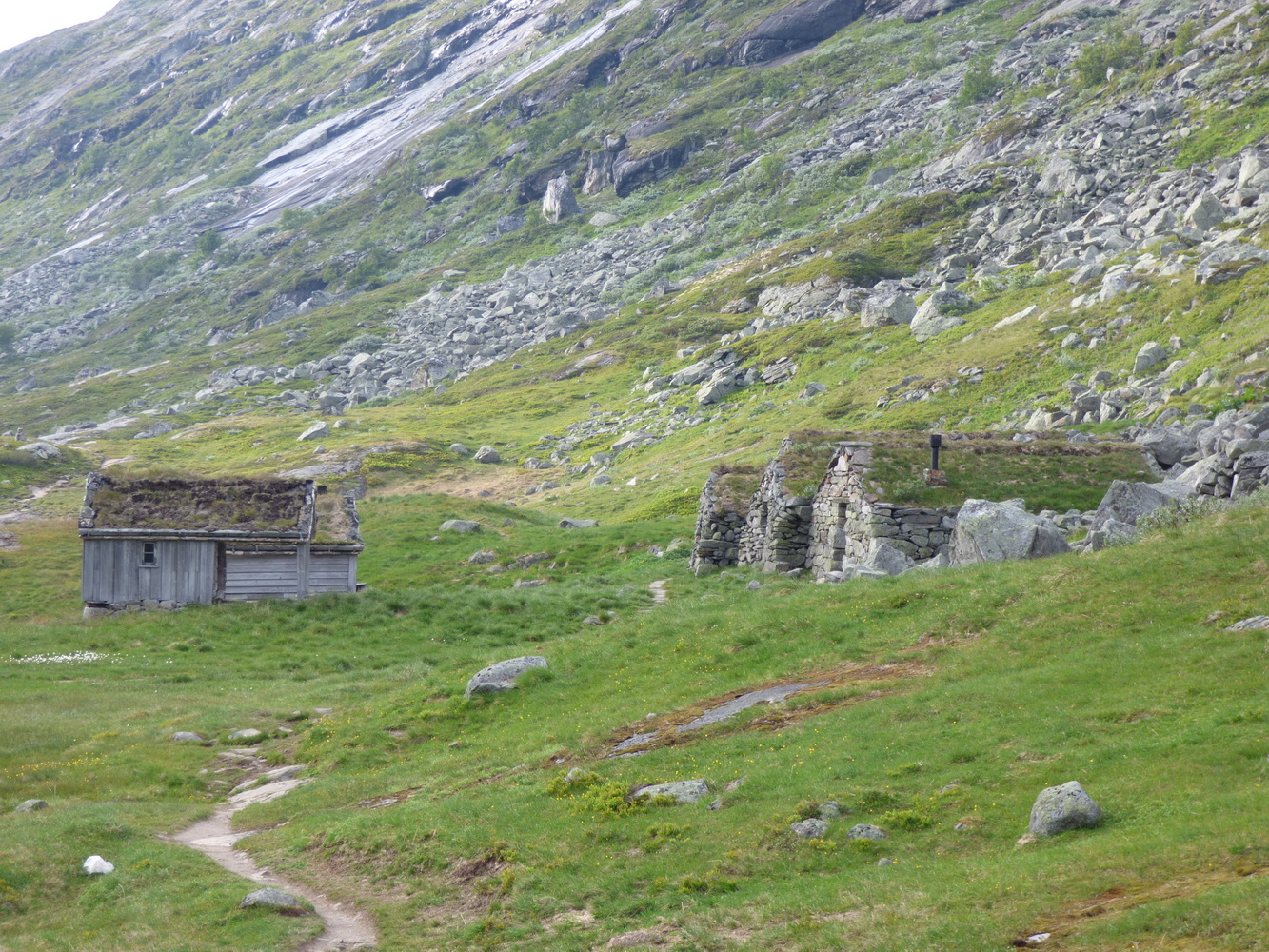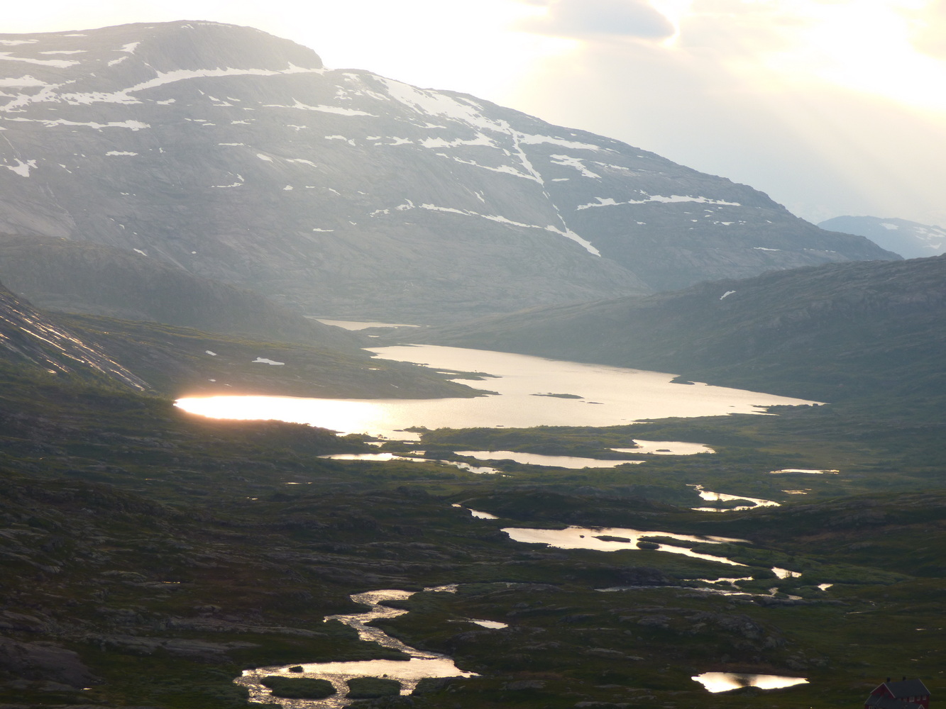 Efter flera vattenfall och en hel del stigning så kom vi sakta upp i dalen som leder in till Hardangervidderna och passerade också Turisthyttan Stavli på vår väg fram mot kvällens tältplats. Det låg några äldre stenhus i närheten av hyttan och där fanns också en utomhuspool i anslutning. Poolen skulle komma att bli välbesökt, vilket jag såg från långt håll när jag zoomade in på den från vårt läger några kilometer längre bort senare på kvällen.