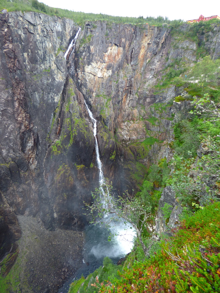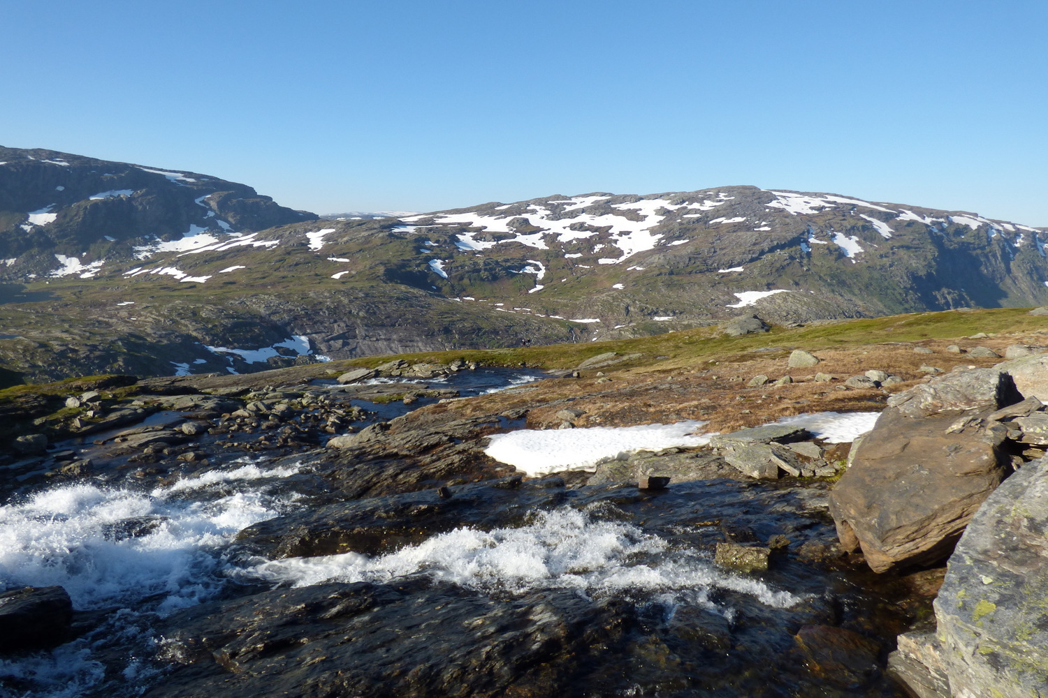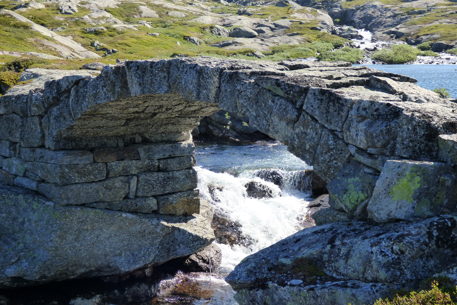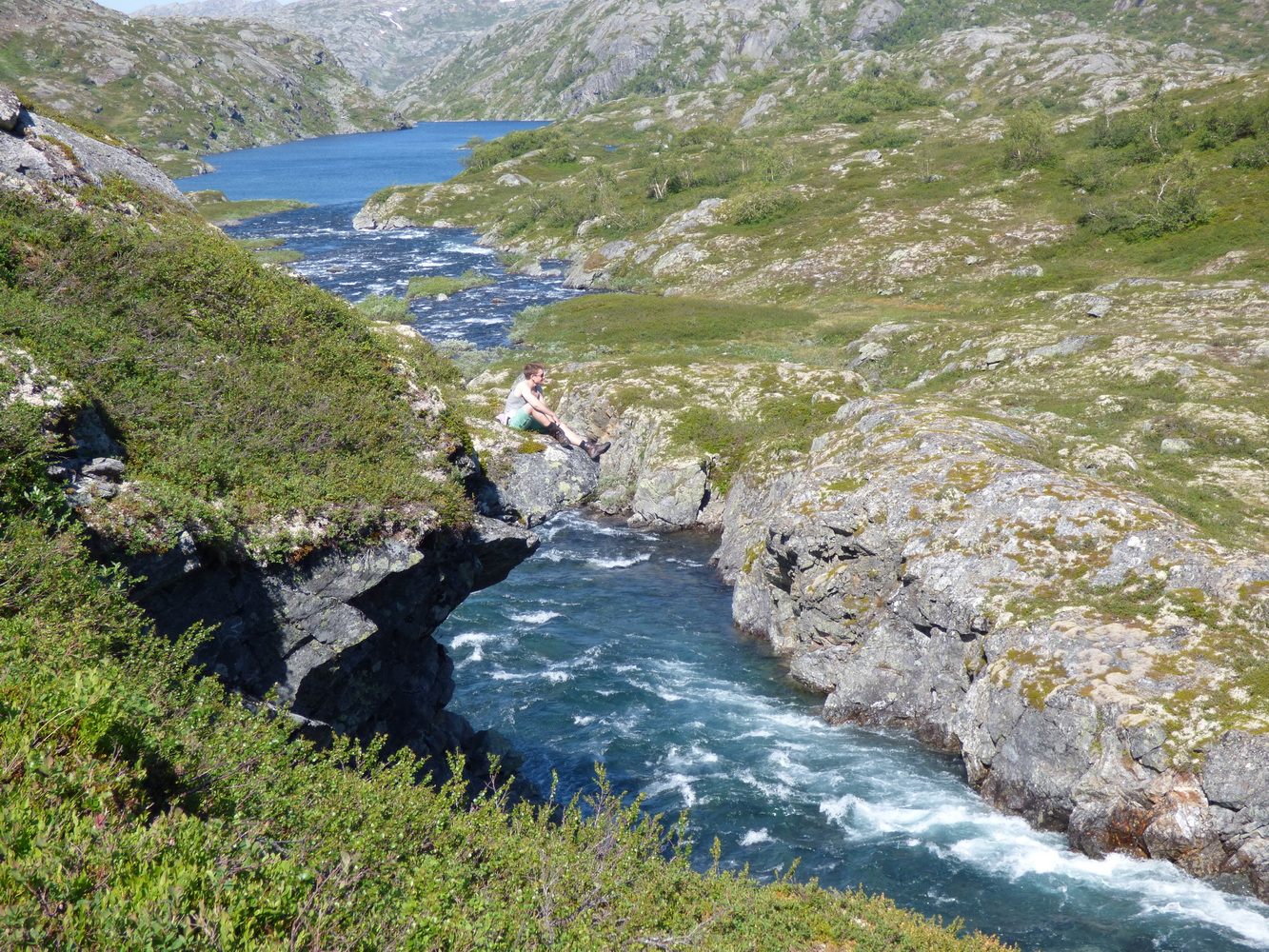 Efter flera vattenfall och en hel del stigning så kom vi sakta upp i dalen som leder in till Hardangervidderna och passerade också Turisthyttan Stavli på vår väg fram mot kvällens tältplats. Det låg några äldre stenhus i närheten av hyttan och där fanns också en utomhuspool i anslutning. Poolen skulle komma att bli välbesökt, vilket jag såg från långt håll när jag zoomade in på den från vårt läger några kilometer längre bort senare på kvällen.