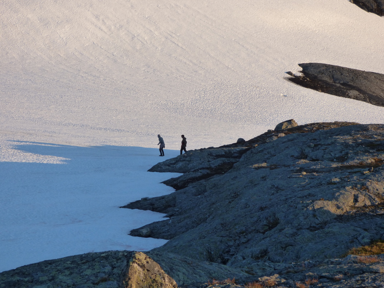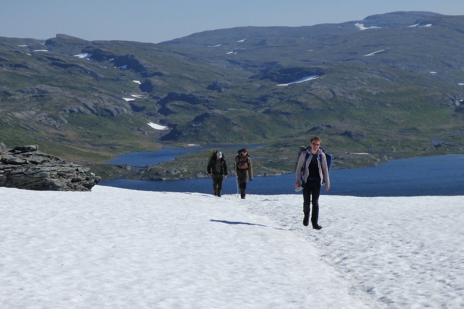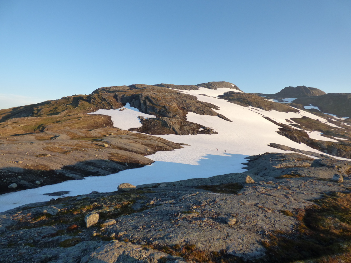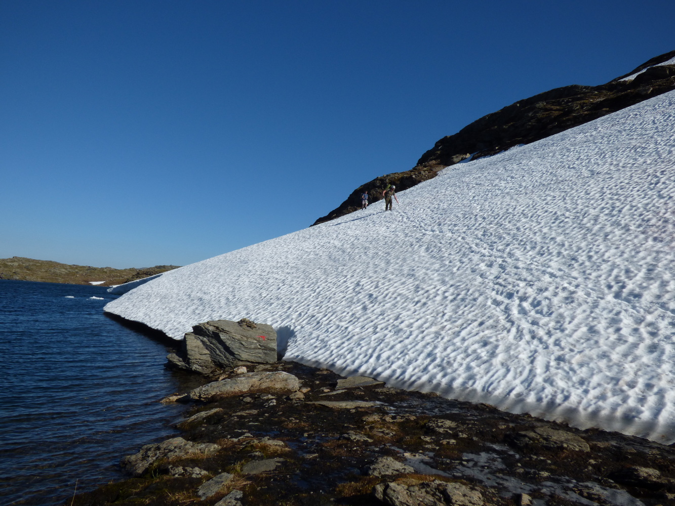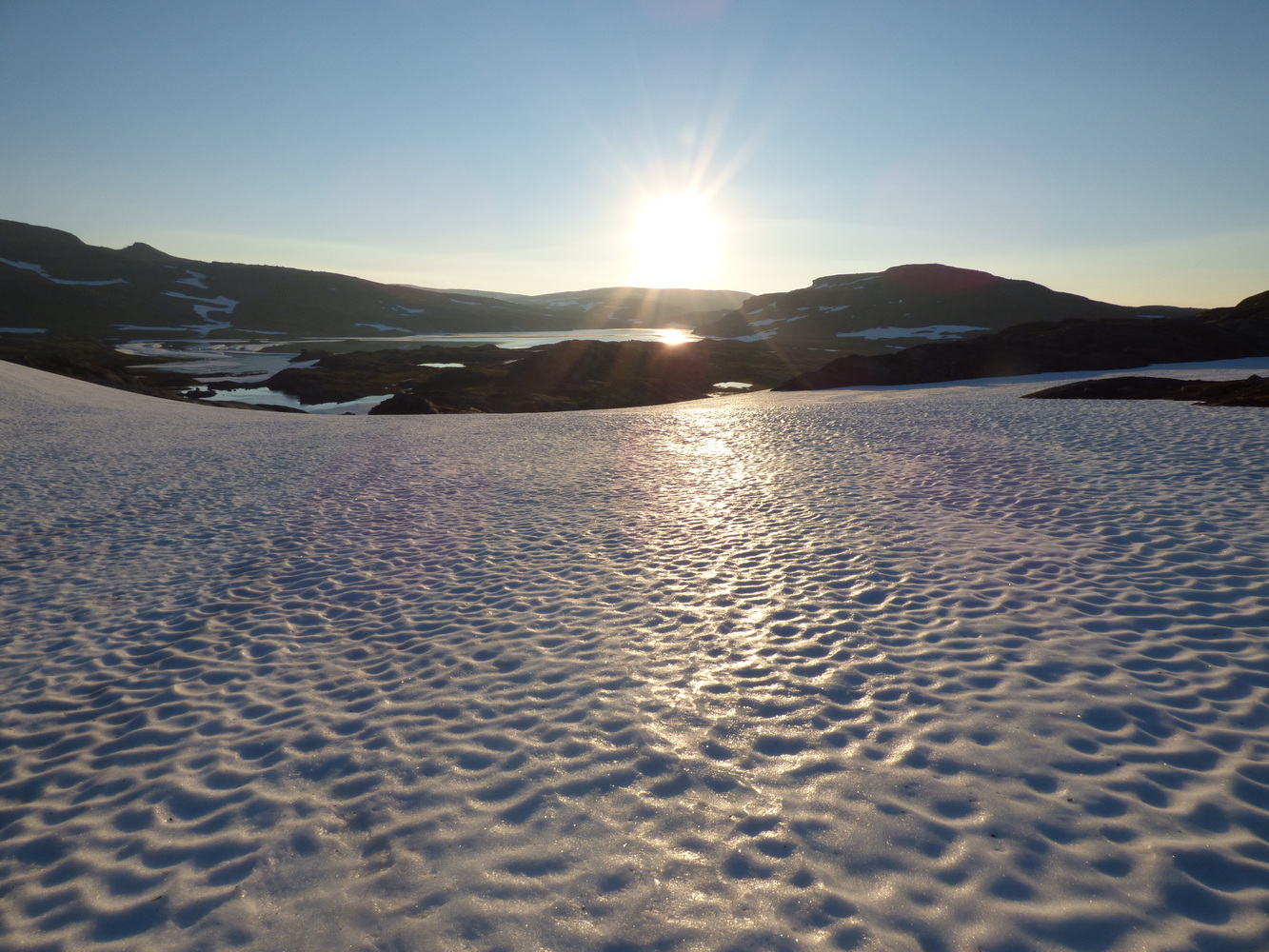 Lite längre upp på fjället låg det hårdpackad snö i snöfält. Nästan som ren is, men inte riktigt. Solen kommer bara åt dem kort eller inte alls. Därav kan dessa fält bli kvar hela sommaren på sina håll. Vi vandrade vidare upp mott toppen som närmade sig.