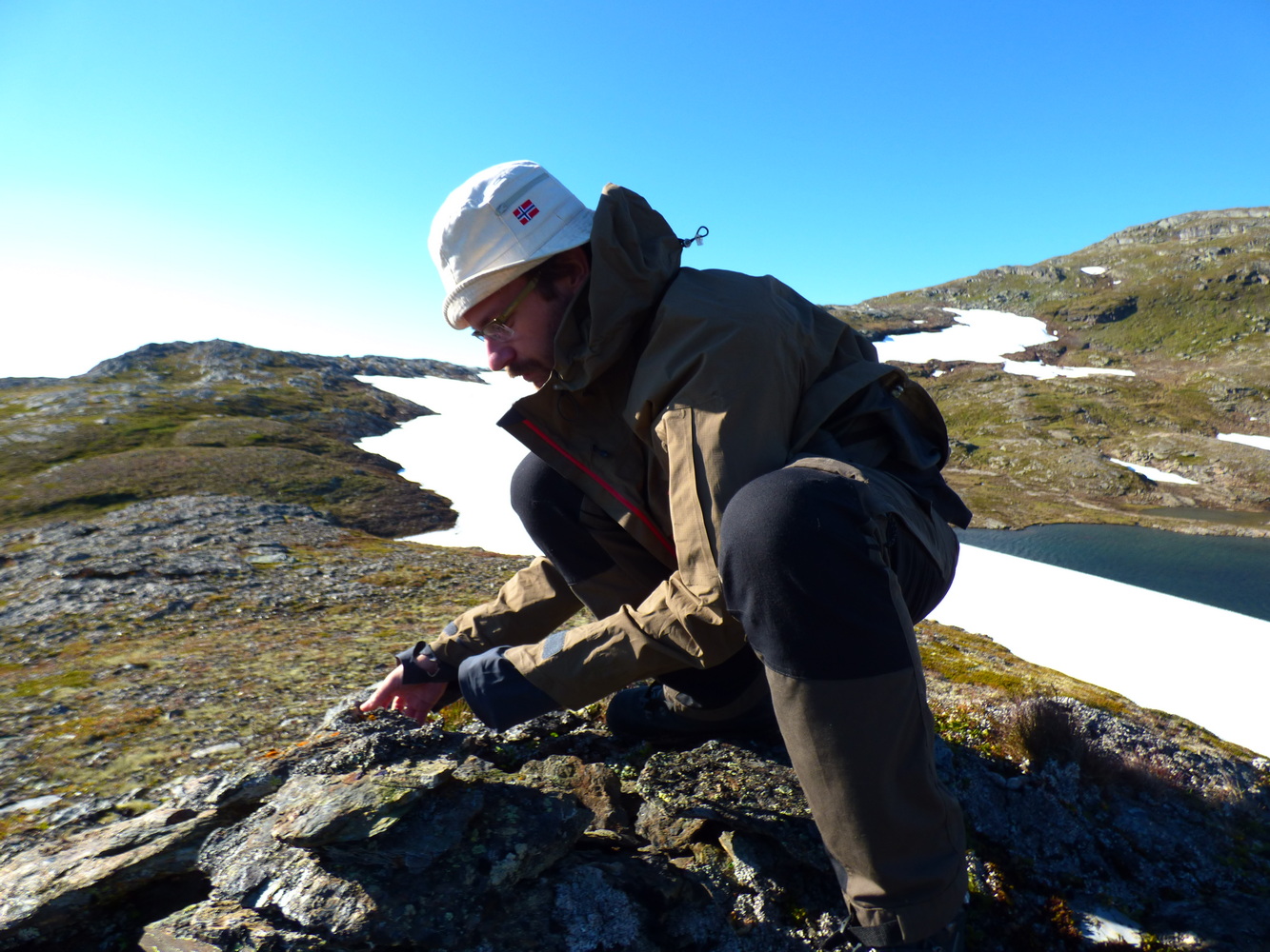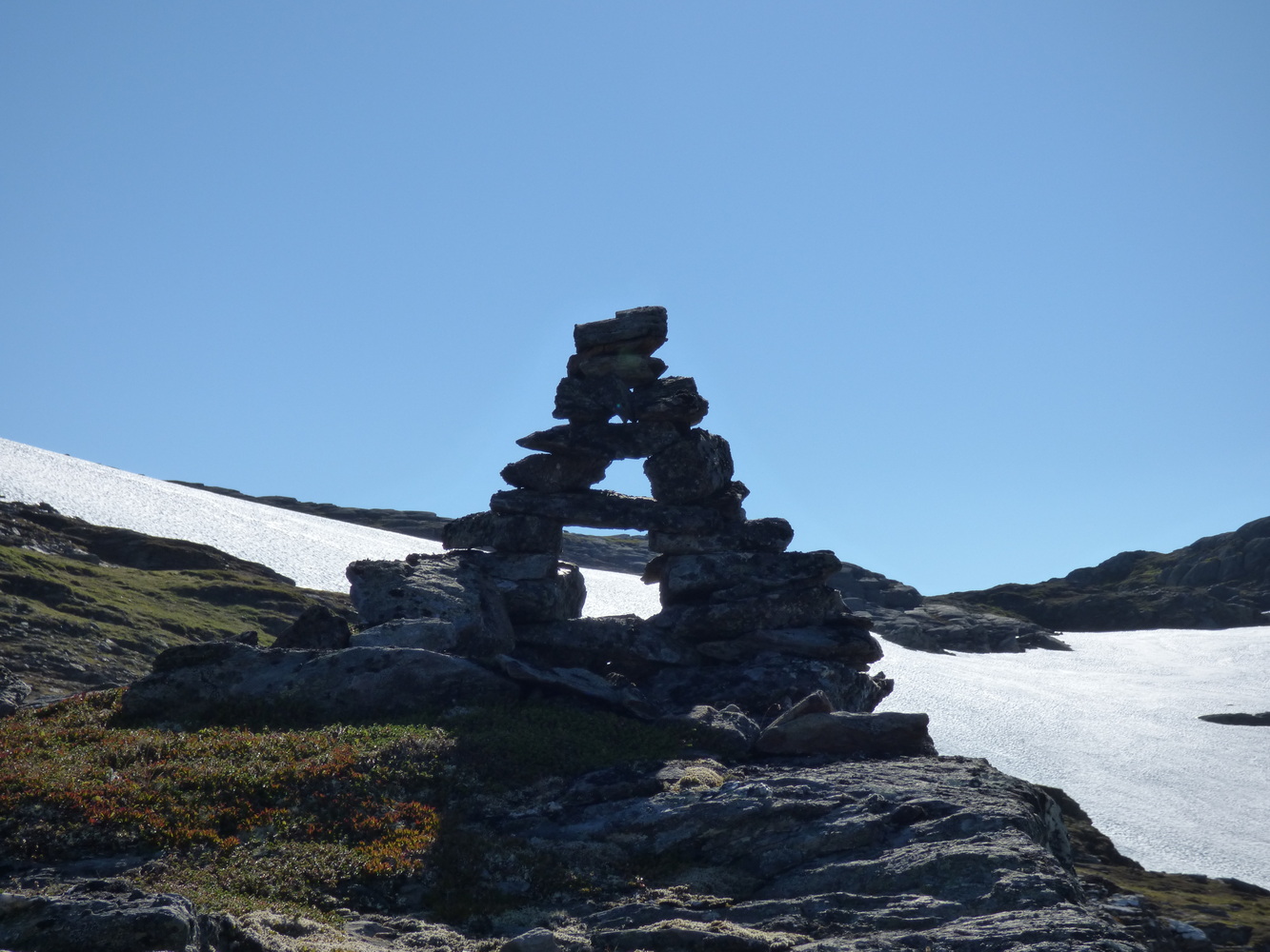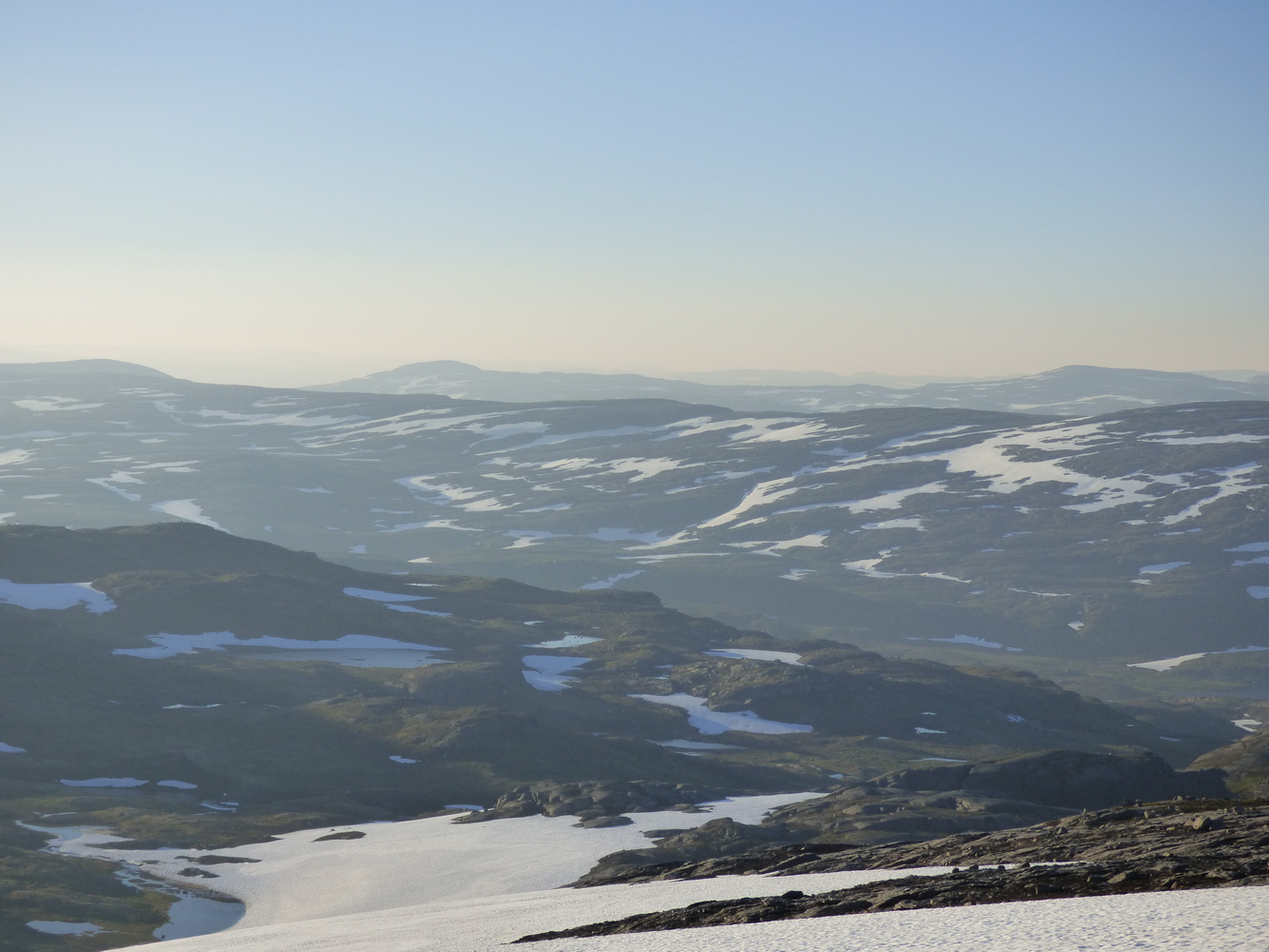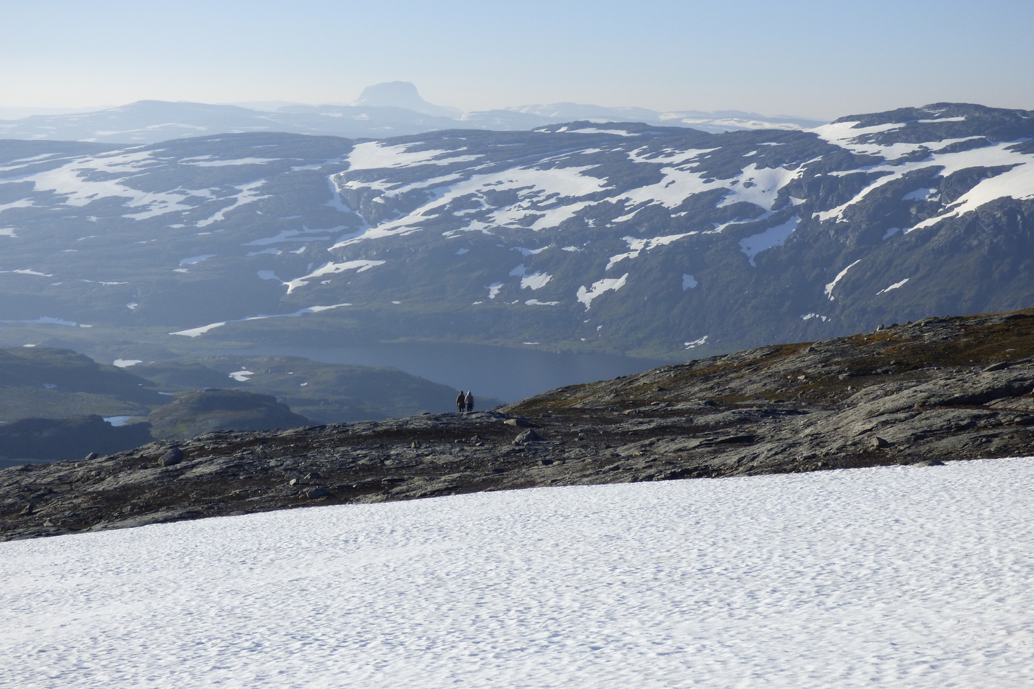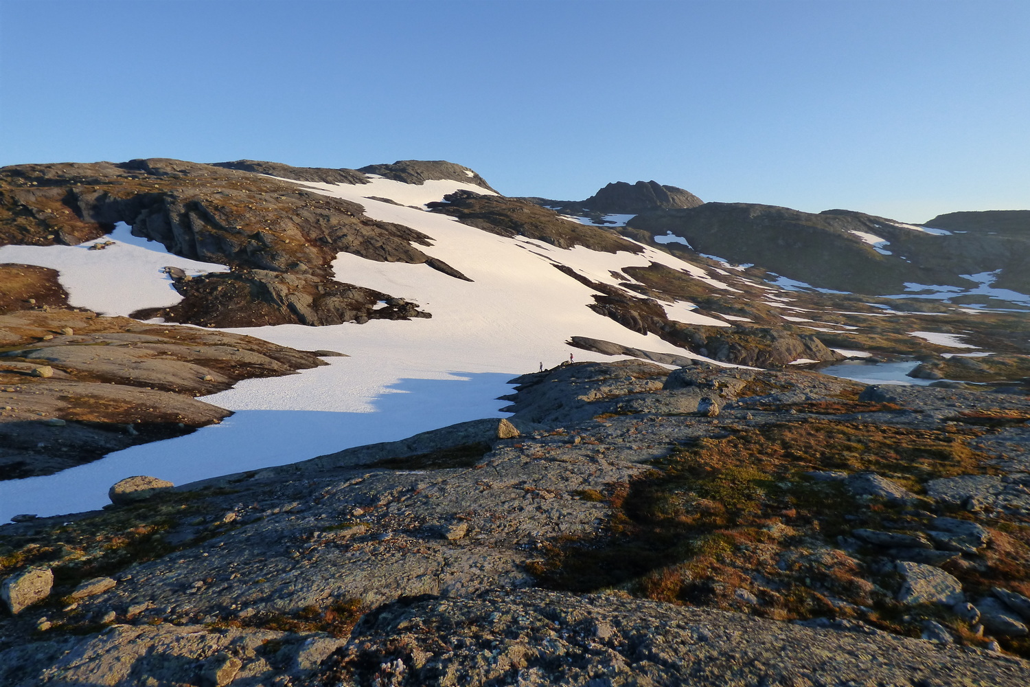Lite längre upp på fjället låg det hårdpackad snö i snöfält. Nästan som ren is, men inte riktigt. Solen kommer bara åt dem kort eller inte alls. Därav kan dessa fält bli kvar hela sommaren på sina håll. Vi vandrade vidare upp mott toppen som närmade sig.