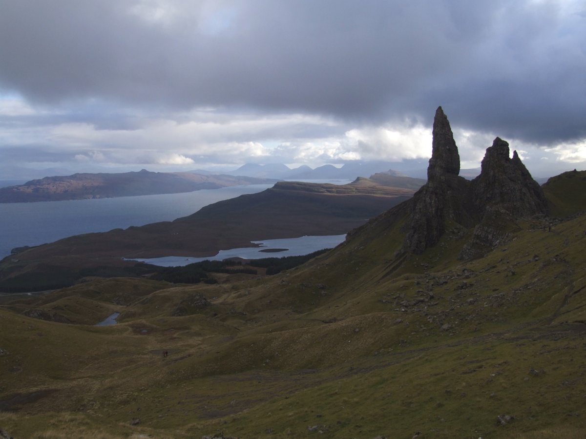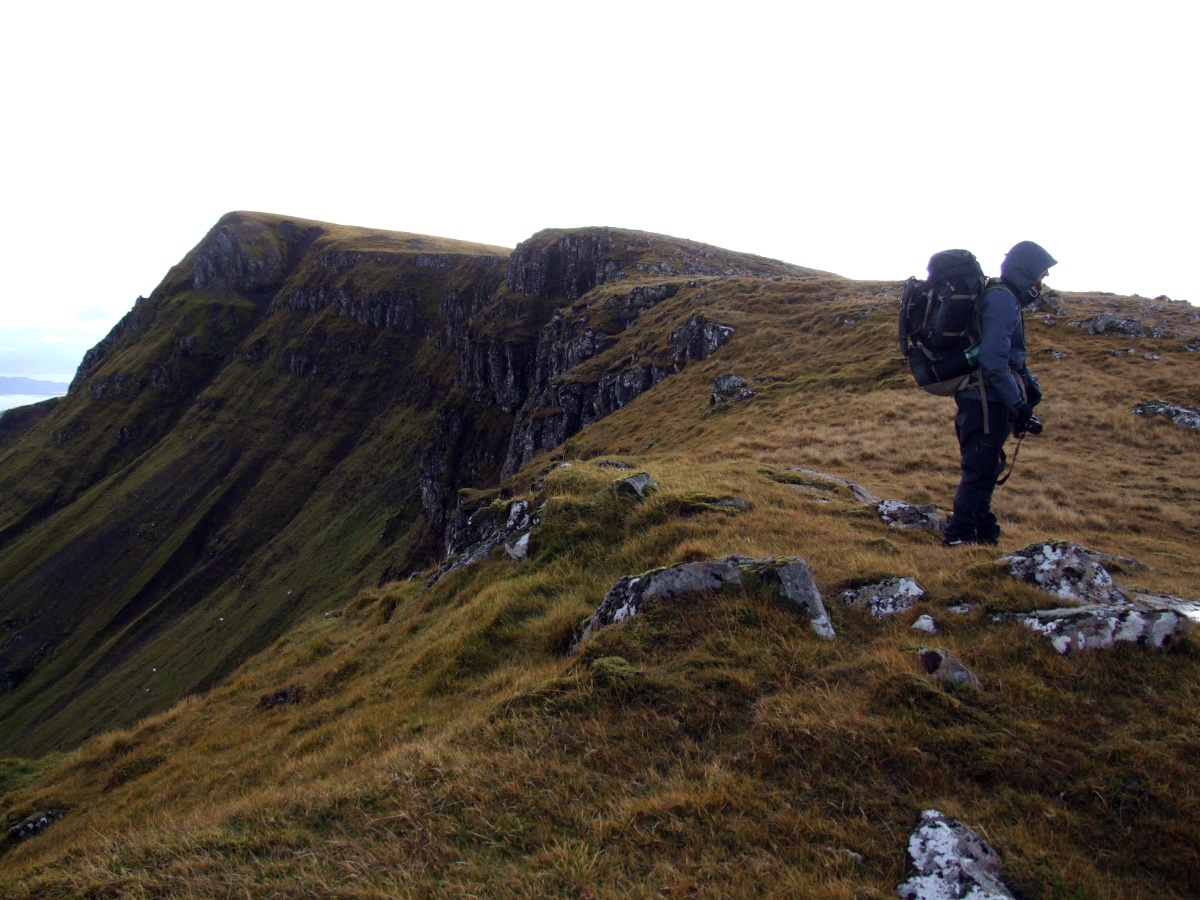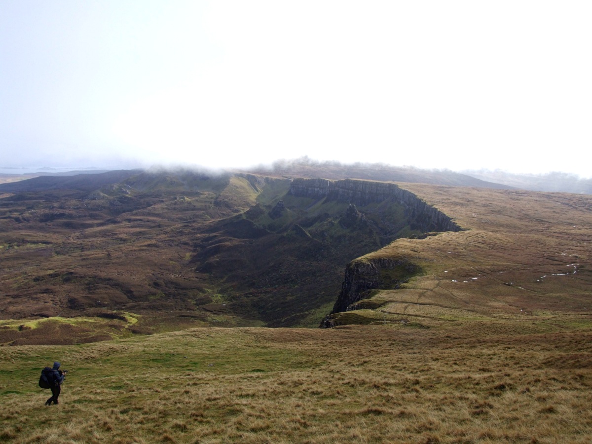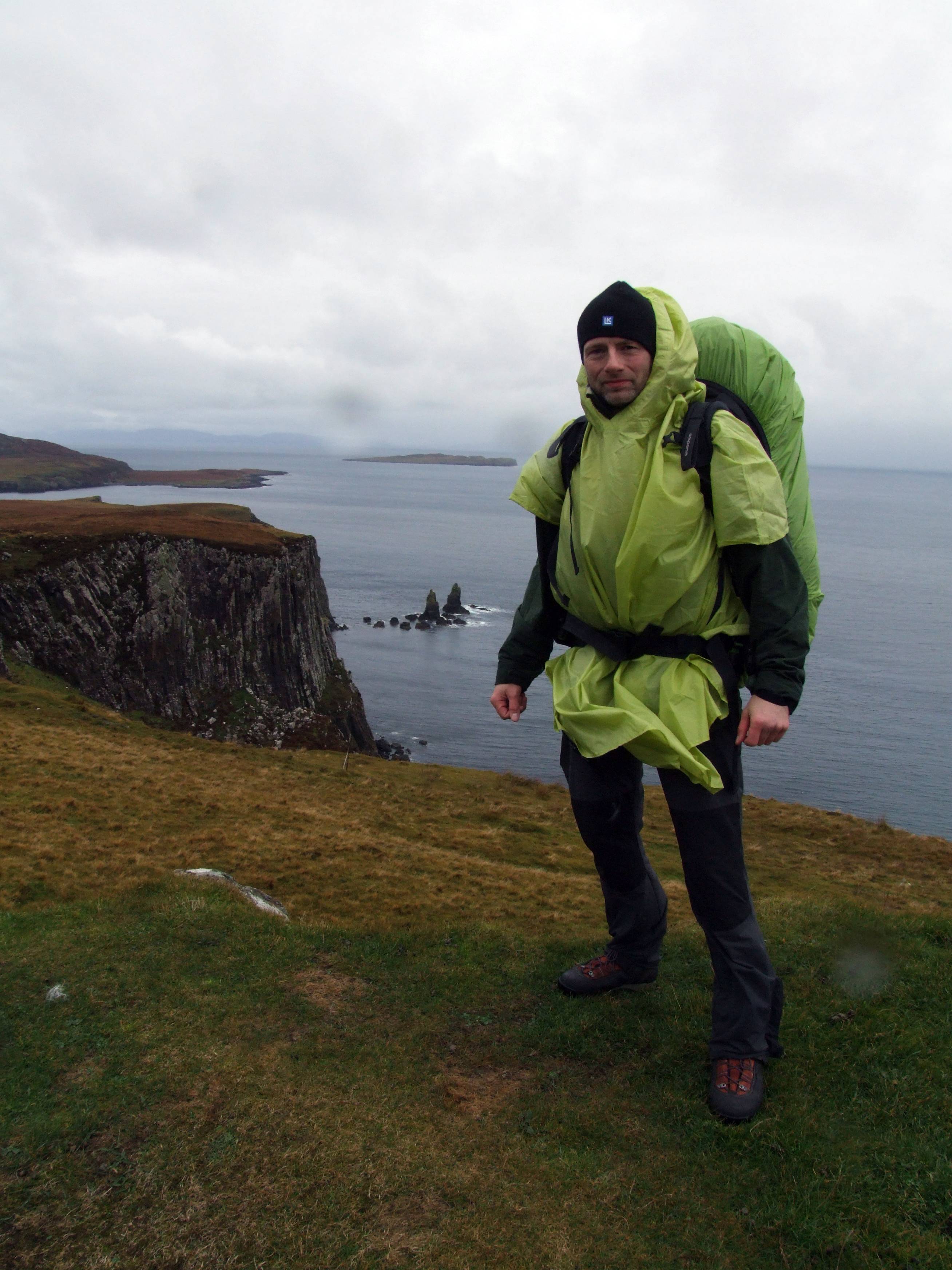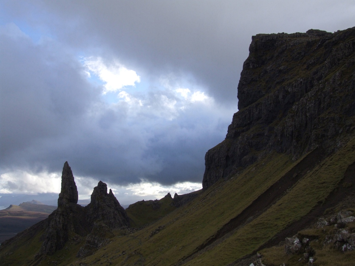 Vandring skulle ta oss från norra udden på Isle of Skye över en förkastning "Trotternish ridge" som löper utmed "Trotternish peninula" på norra delen av Skye och förbi denna klippa. Det innebar att vi skulle vandra utmed ett brant stup flera dagar innan den lilla pitoreska byn Portree sedemera bli vår slutdestination. Jag hade hittat en internetsida med information om denna vandring och eftersom mycket av leden är omarkerad så var det till stor hjälp att ha leden i form av gps koordinater i en liten handhållen Garmin GPS som jag hade med mig. Här uppe skulle dimman visa sig bli lika mystisk som på film och utan god kännedom så skulle man lätt kunna gå vilse.