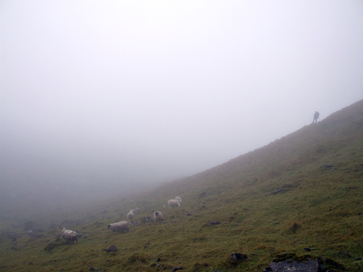 Regnet, vinden och den genomblöta myrmarken var påtagligt utmanande men när vi kommit bort från kustlandet blev det nästan kusligt lugnt. Som att kliva in i ett sagoland av dimma. Här var det som att tiden stod stilla och hade det inte varit för några får så hade man kunnat tro att det var helt öde.