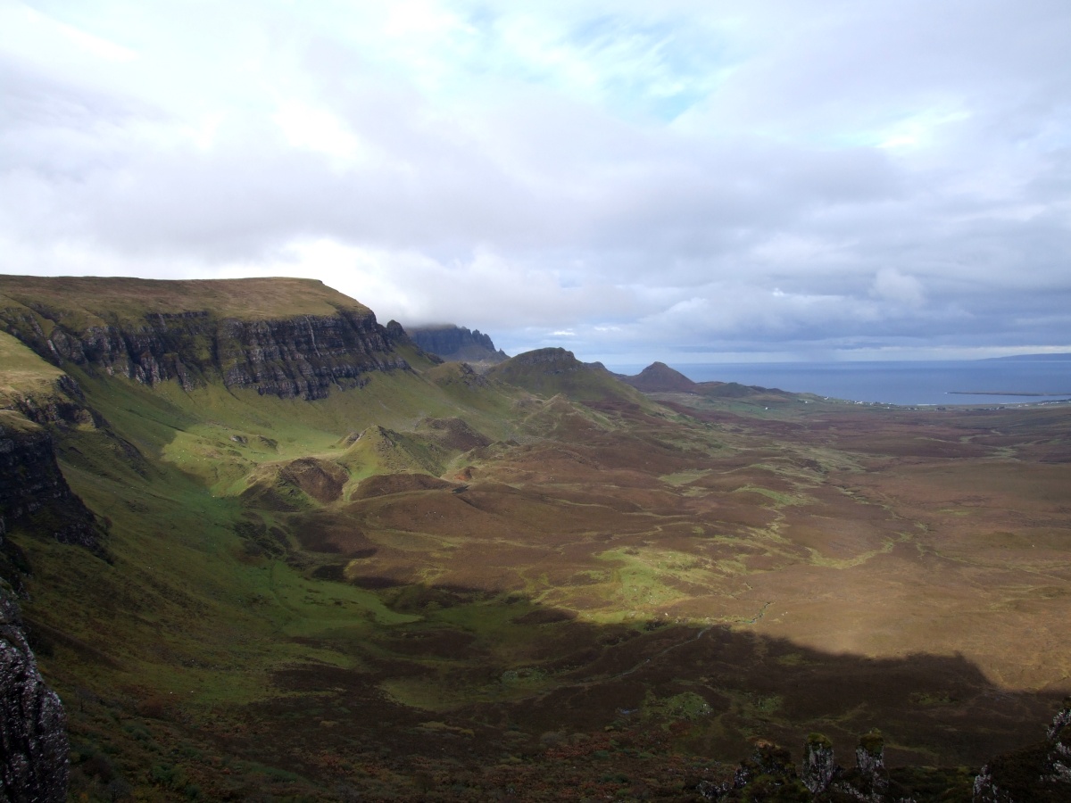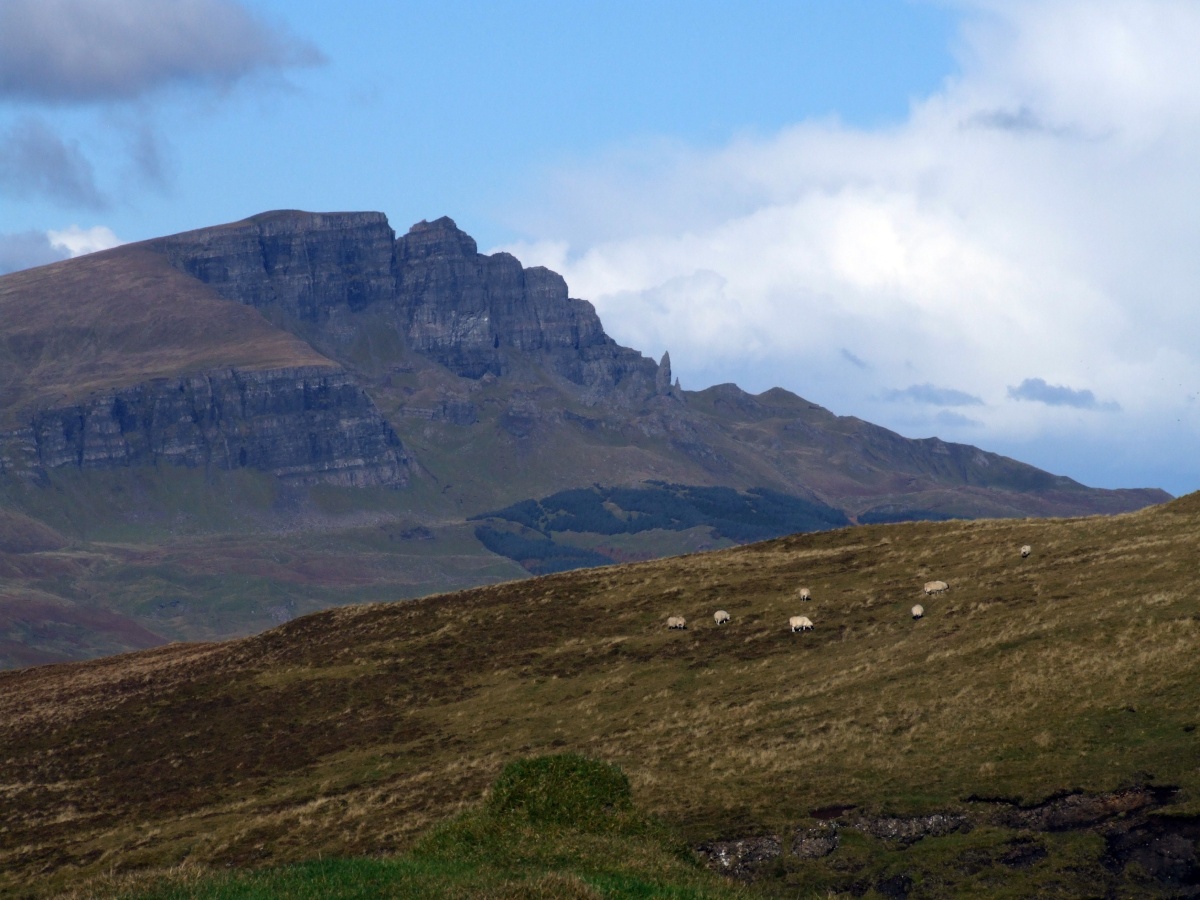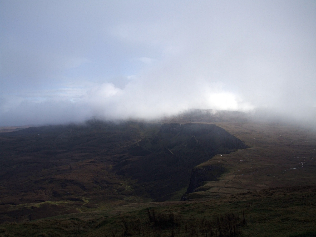 Vi började vandringen från öns norra spets och redan när vi klev av den lokala bussen så hälsade det Skotska vädret oss välkomna med regn och hård blåst. Men efter en kort paus vid norra spetsens monument så var det bara att sätta av inåt ön och dess mäktiga bergsformationer. Den hårda vinden lugnade sig till en absolut tystnad när vi kom in i den dimmbehöljda dalgången. Landskapet och väderförhållanden skulle visa sig mäktiga tillsammans, både med sin stillhet i dalgångarna och sin rytande blåst på ryggen av förkastningen.