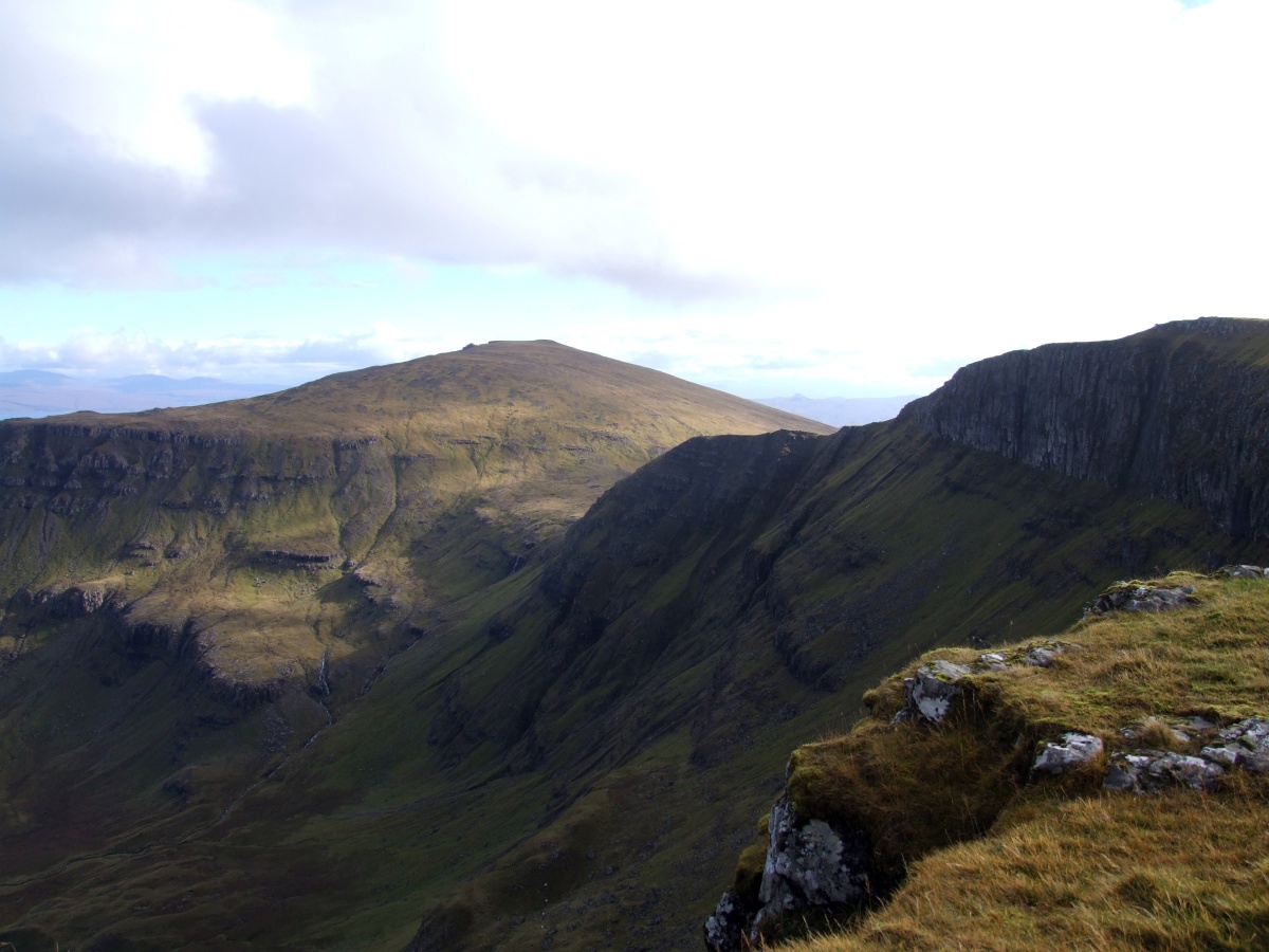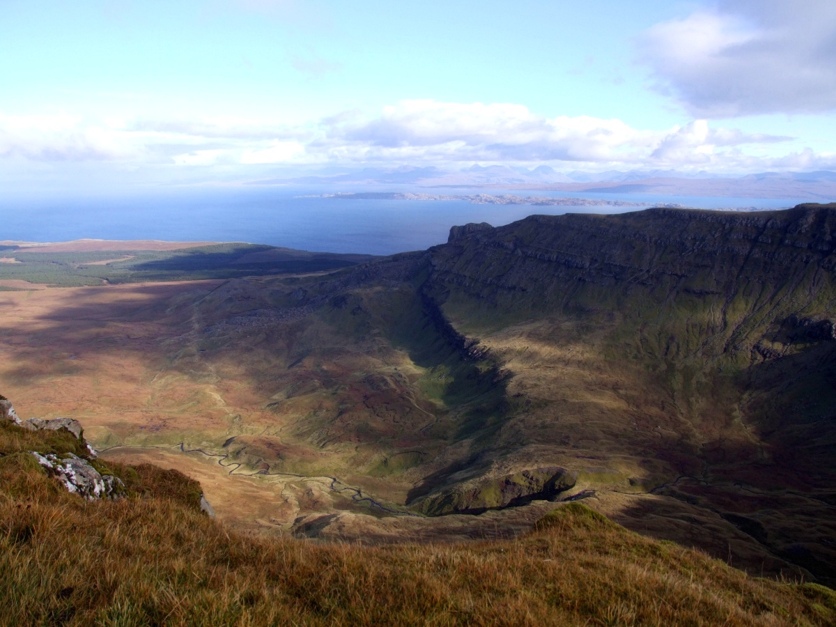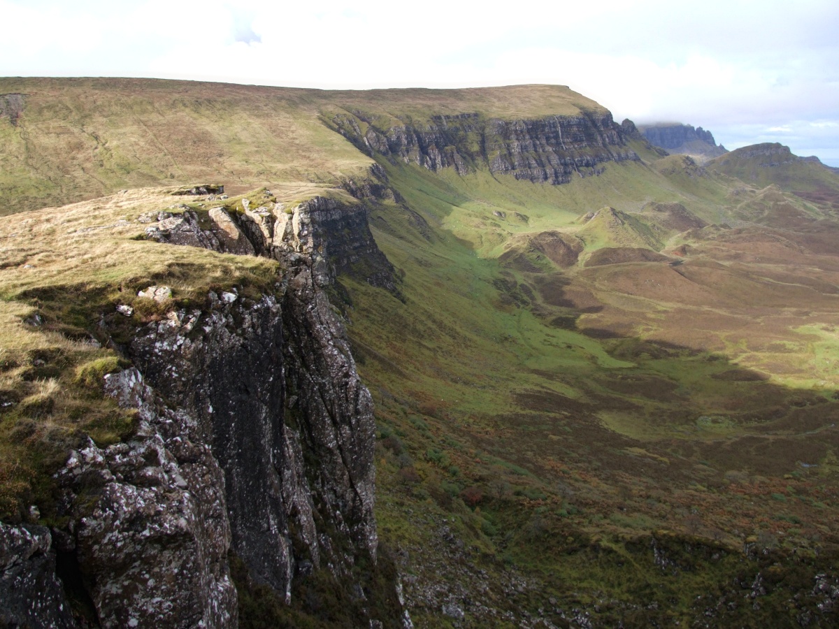 Vi började vandringen från öns norra spets och redan när vi klev av den lokala bussen så hälsade det Skotska vädret oss välkomna med regn och hård blåst. Men efter en kort paus vid norra spetsens monument så var det bara att sätta av inåt ön och dess mäktiga bergsformationer. Den hårda vinden lugnade sig till en absolut tystnad när vi kom in i den dimmbehöljda dalgången. Landskapet och väderförhållanden skulle visa sig mäktiga tillsammans, både med sin stillhet i dalgångarna och sin rytande blåst på ryggen av förkastningen.