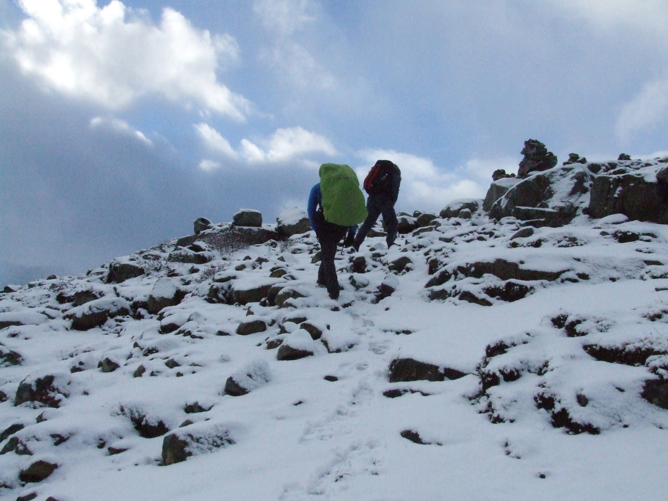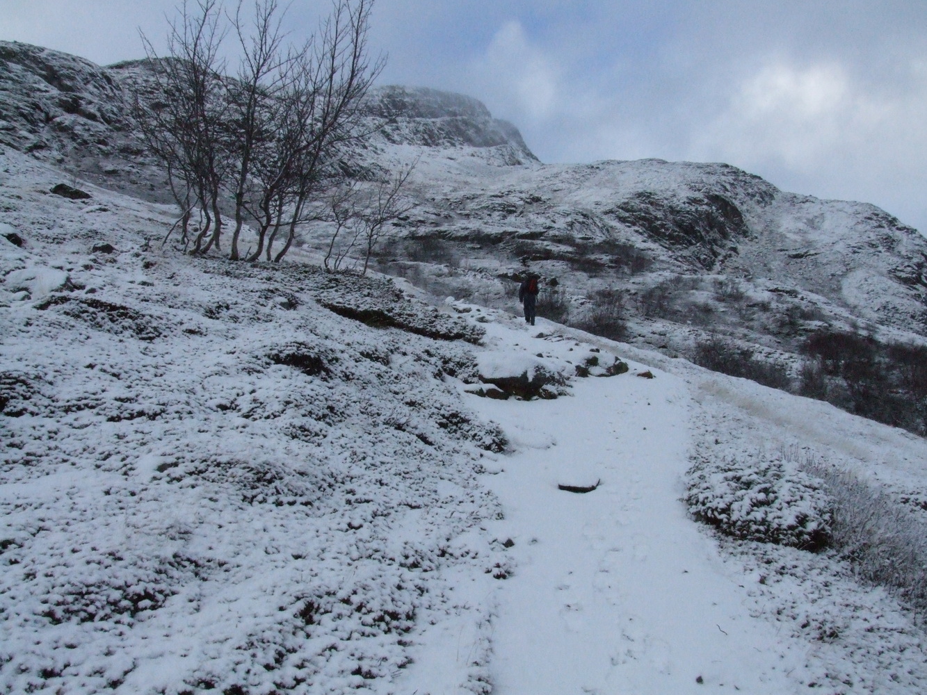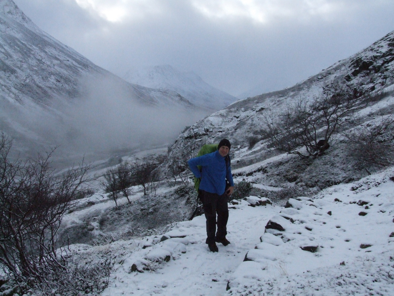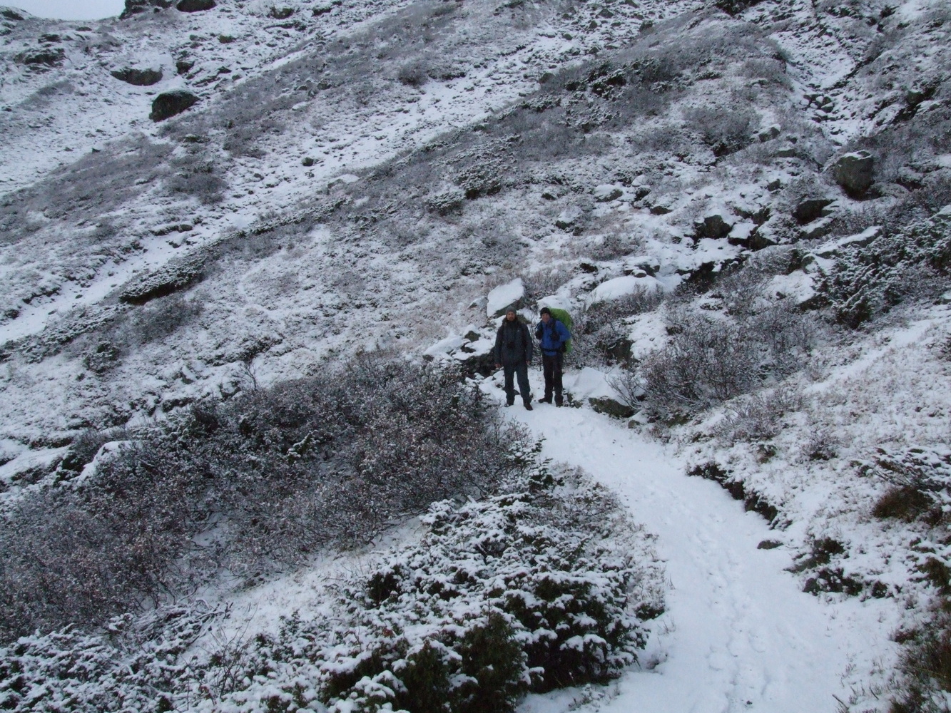 Vi startade vår stigning och bara några hundra meter upp så var det redan ett tunt lager snö på marken. Det var ganska vindstilla och en mycket vacker miljö med en temperatur på någon minusgrad. Inget bekymmer alls när man vandrar och rör sig. Men i mitt huvud hade jag inte sett framför mig ett snöklätt berg även om det naturligtvis hade varit logiskt om jag hade fördjupat mig i när det börjar bli vinter här och att höjdmeter snart gör stor skillnad.