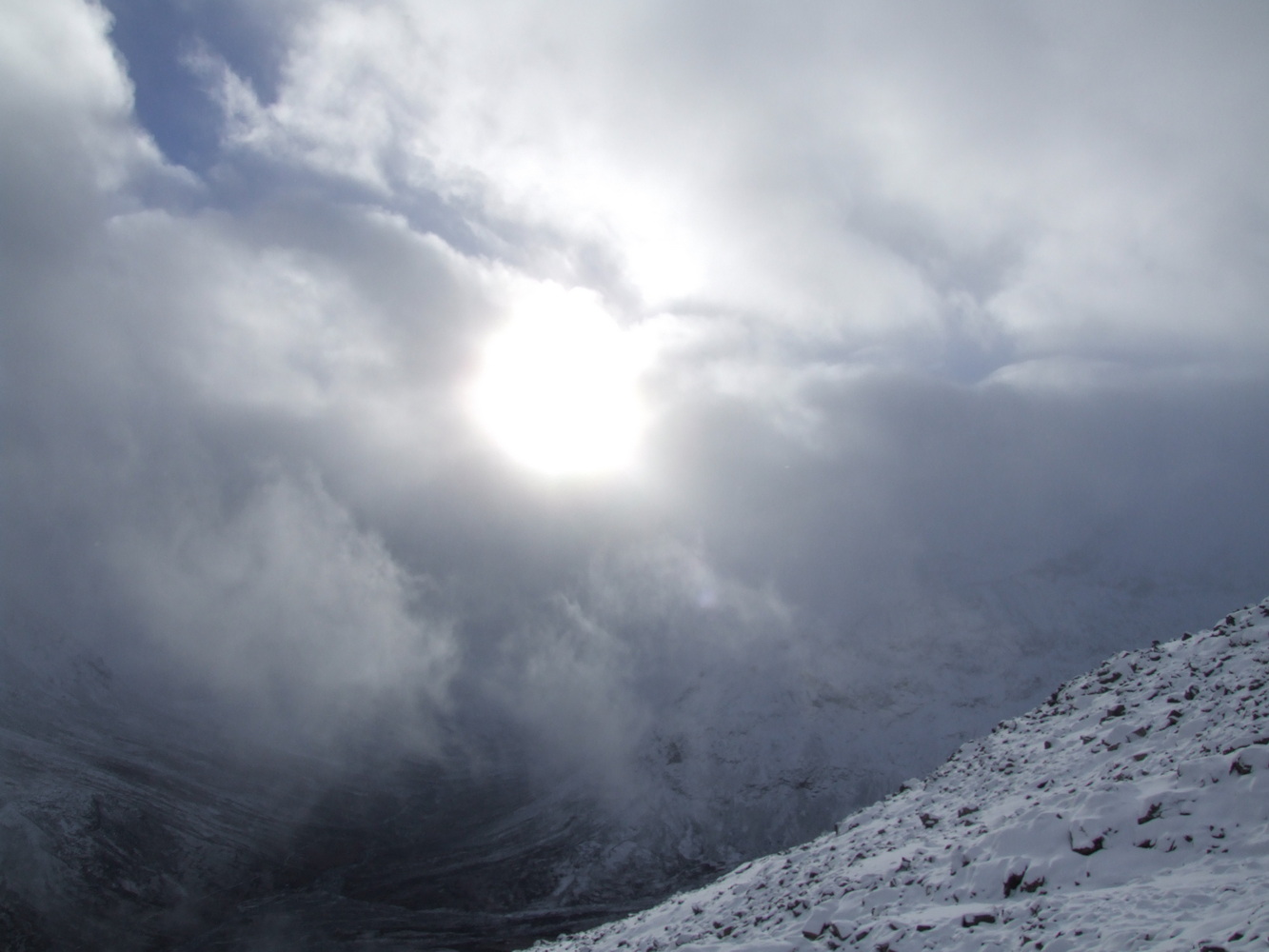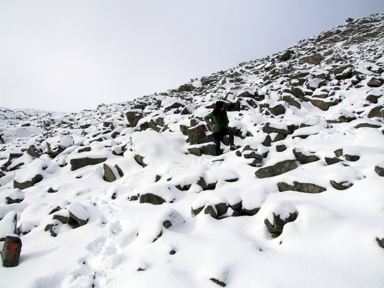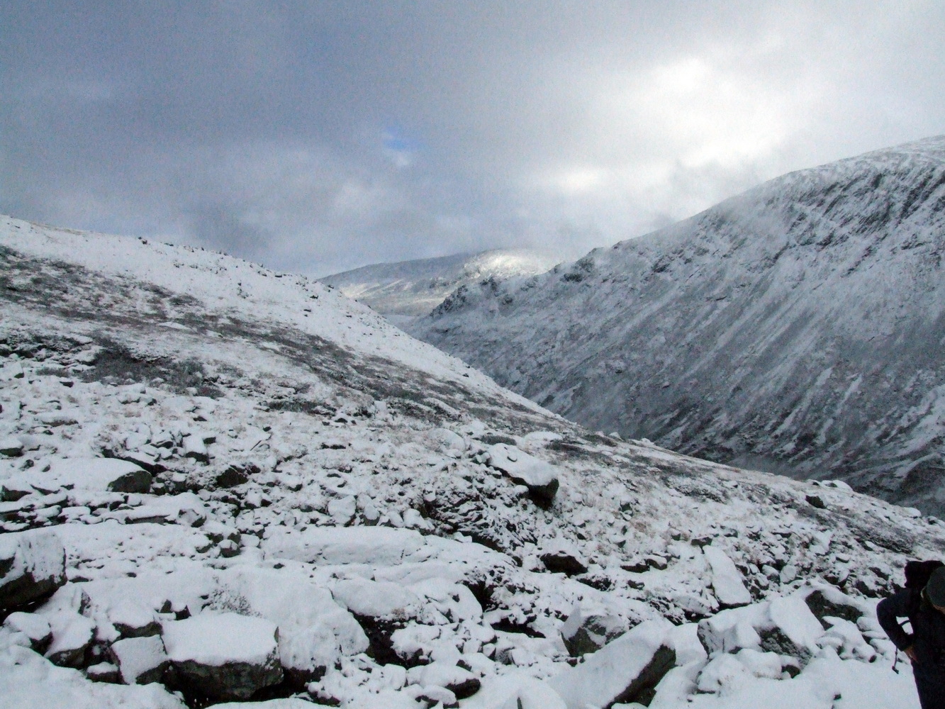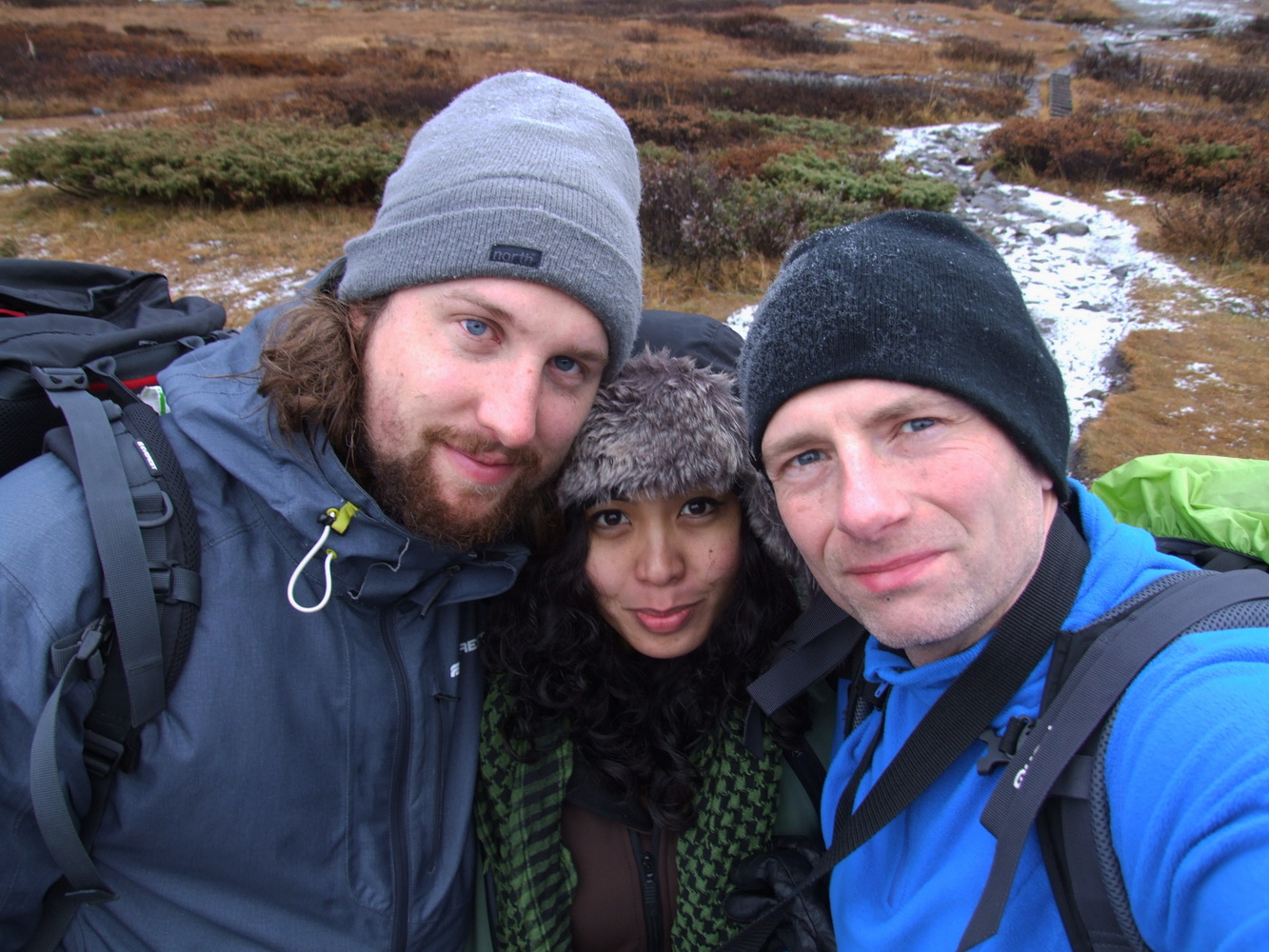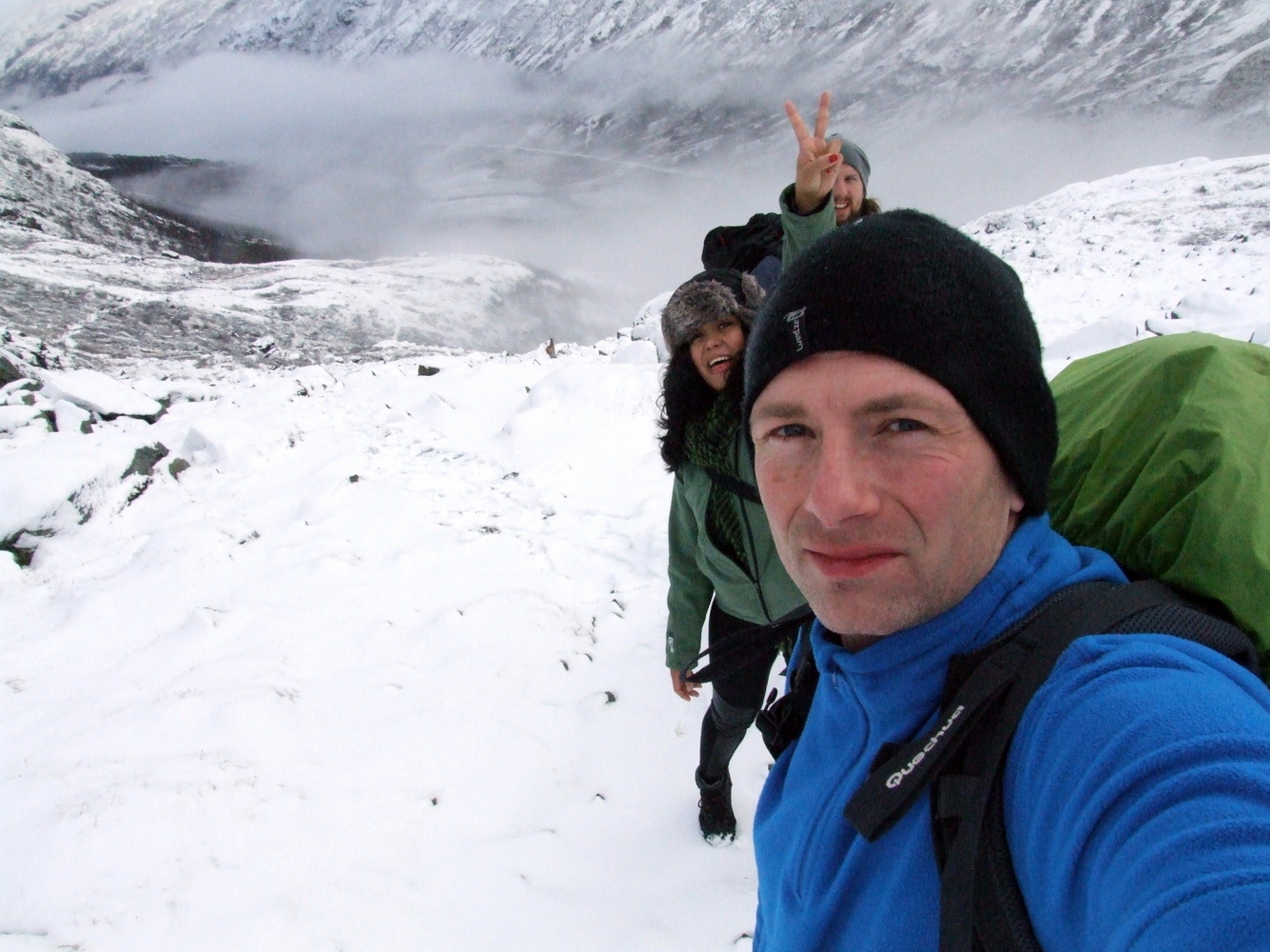 Vi startade vår stigning och bara några hundra meter upp så var det redan ett tunt lager snö på marken. Det var ganska vindstilla och en mycket vacker miljö med en temperatur på någon minusgrad. Inget bekymmer alls när man vandrar och rör sig. Men i mitt huvud hade jag inte sett framför mig ett snöklätt berg även om det naturligtvis hade varit logiskt om jag hade fördjupat mig i när det börjar bli vinter här och att höjdmeter snart gör stor skillnad.