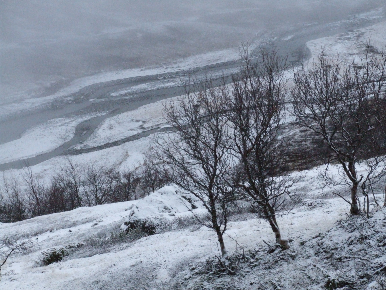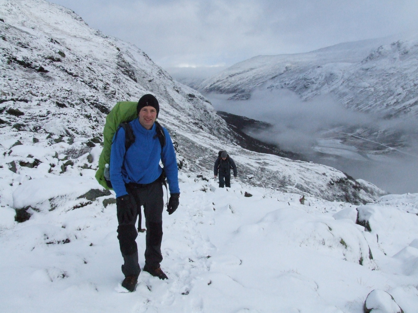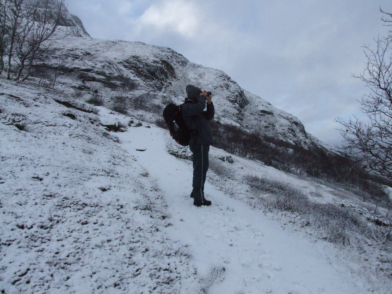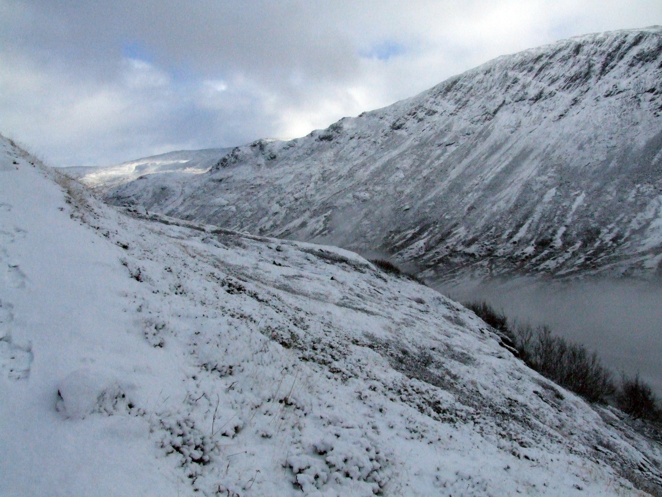 Vi lämnade dalen bakom oss och kom allt högre upp på bergssidan. Det var vackert och stilla nedanför och vi såg fortfarande hoppfullt på stigningen. Snön var inte så djup och även om ledens markering var mestadels täckt så kändes det tryggt med spåret i GPSn jag hade om vi inte skulle se markeringarna.