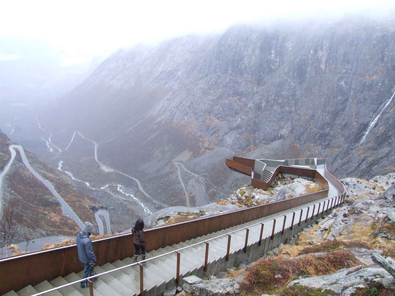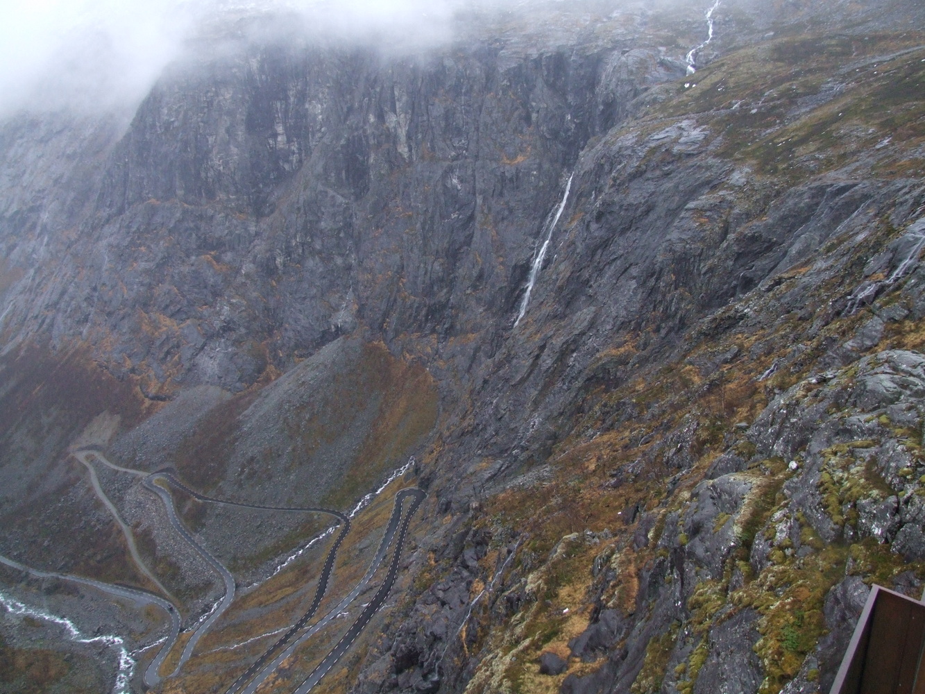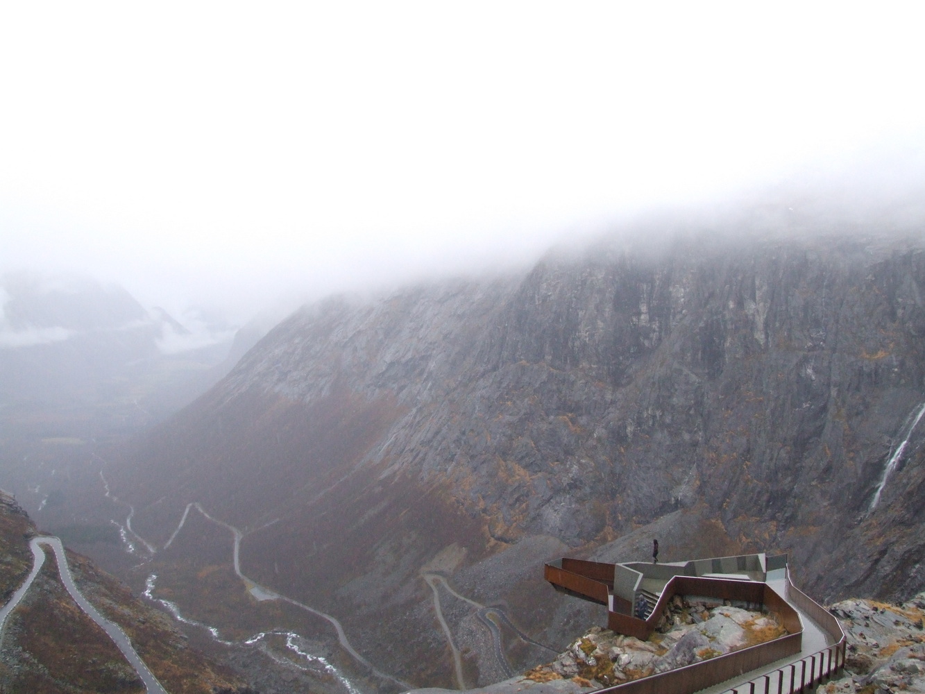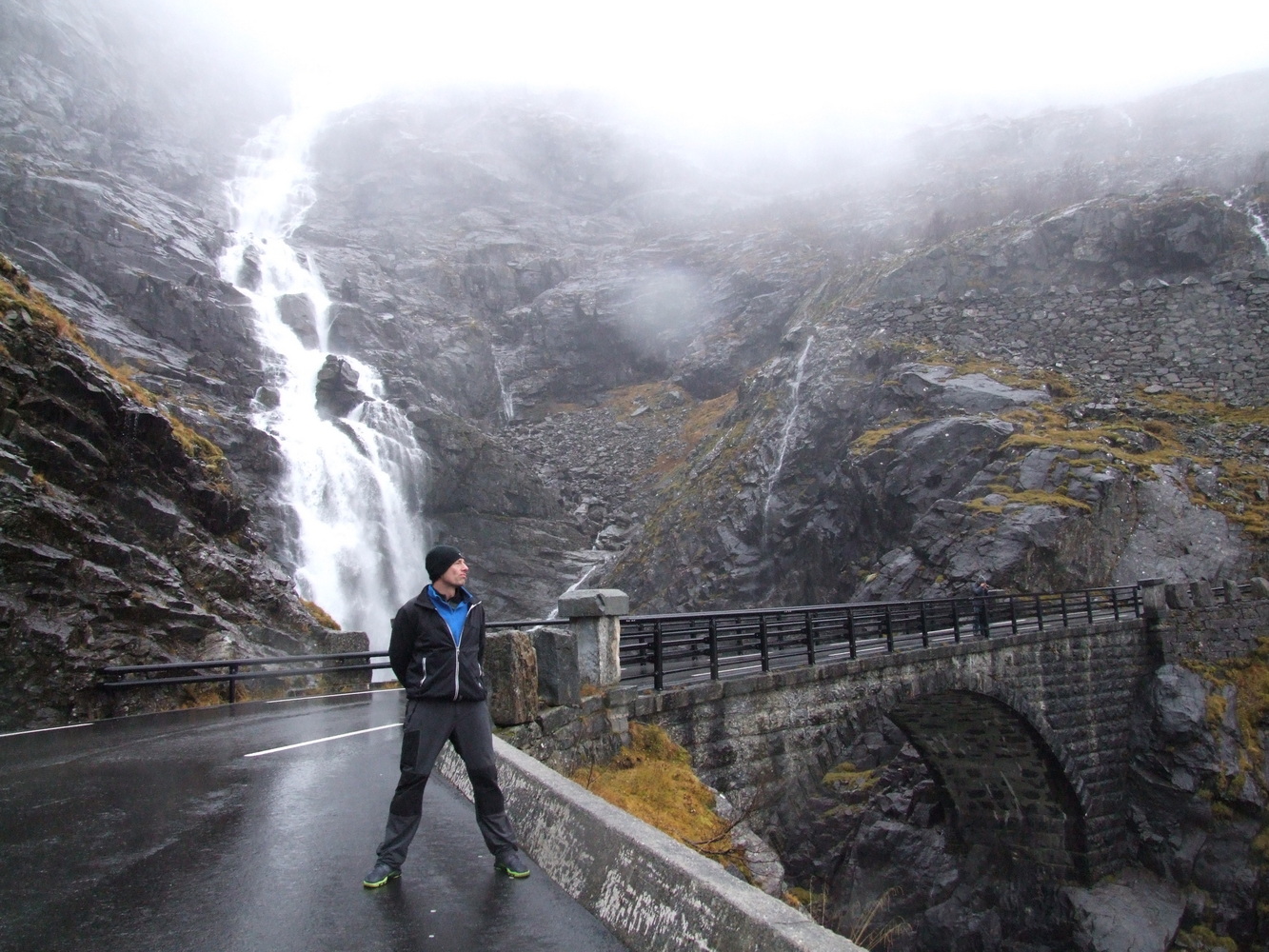 Den här platsen brukar vara full med turister så att få undersöka den och få ha den för sig själv vägde väl upp att vädret inte var det bästa. Utsikten ner över serpentinvägen med vattenfallen som sipprar ut från bergssidorna var häpnadsväckande. Det museum som finns på passets topp om dess historia var stängt och vägen skulle stänga för säsongen dagen därpå fick vi reda på av en lokalbo. Vi var mycket glada över att fått hinna se och uppleva den här utsikten innan vi fortsatte mot Geirangerfjorden och vattenfallet de sju systrarna som bland annat varit flitigt porträtterat i TV-serien Vikings vinjett. Lite ödmjukare inför vinterbestigning och med nya erfarenheter och lärdommar vände jag och mina vänner därefter hemåt.
