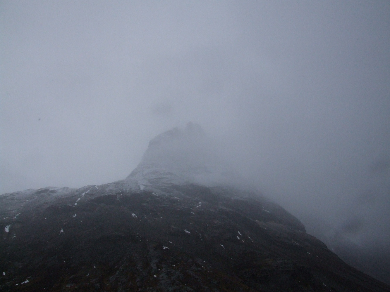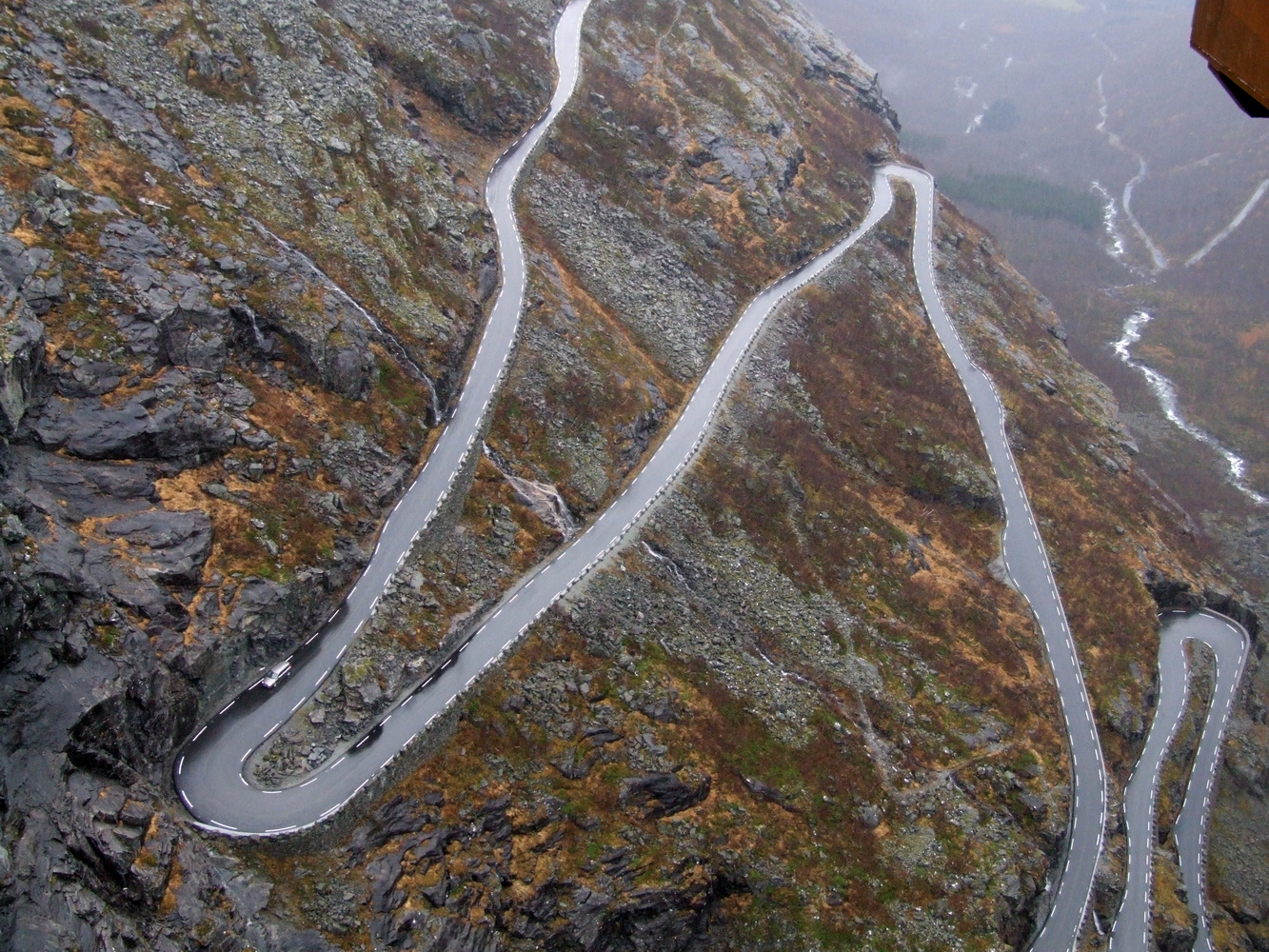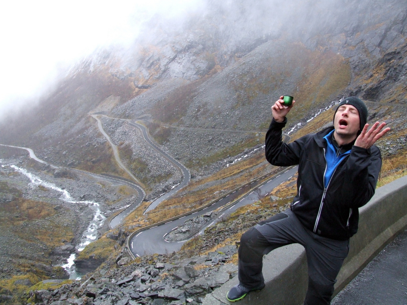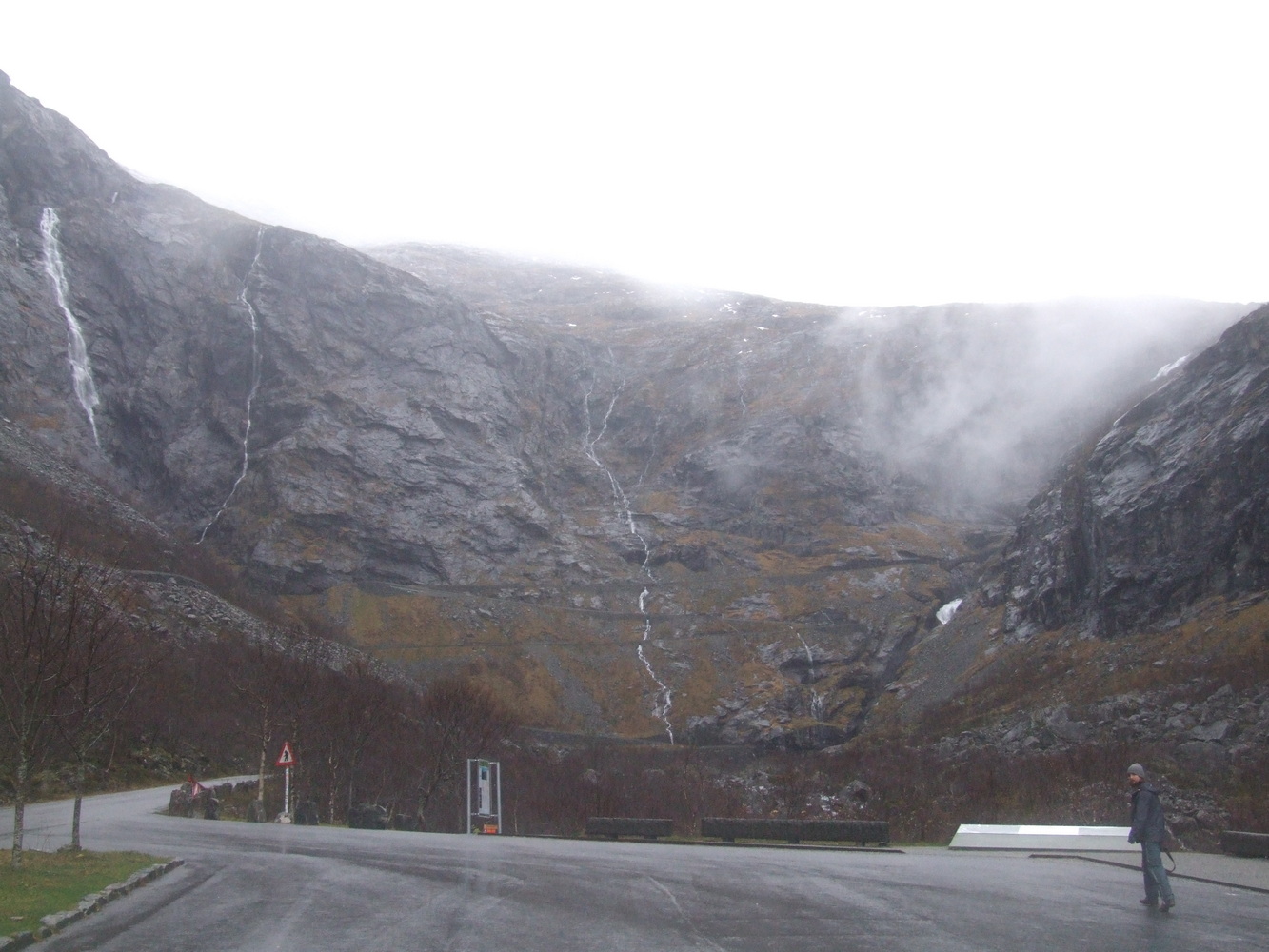Den här platsen brukar vara full med turister så att få undersöka den och få ha den för sig själv vägde väl upp att vädret inte var det bästa. Utsikten ner över serpentinvägen med vattenfallen som sipprar ut från bergssidorna var häpnadsväckande. Det museum som finns på passets topp om dess historia var stängt och vägen skulle stänga för säsongen dagen därpå fick vi reda på av en lokalbo. Vi var mycket glada över att fått hinna se och uppleva den här utsikten innan vi fortsatte mot Geirangerfjorden och vattenfallet de sju systrarna som bland annat varit flitigt porträtterat i TV-serien Vikings vinjett. Lite ödmjukare inför vinterbestigning och med nya erfarenheter och lärdommar vände jag och mina vänner därefter hemåt.