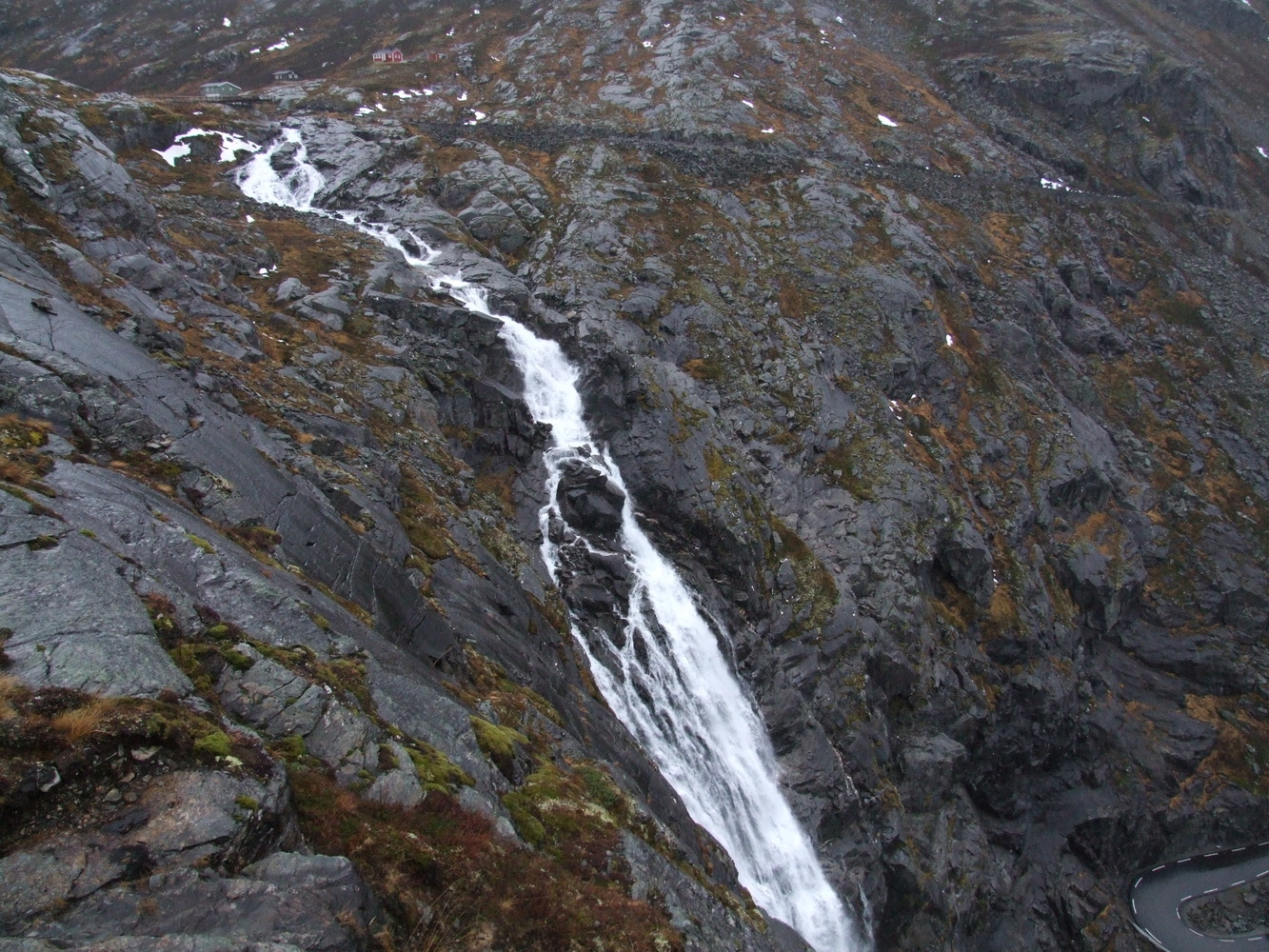 En bit upp på Trollstigen så kommer man till ett vattenfall som är ett par hundra meter högt och rinner under vägbron där vattnet faller ytterligare hundratals meter ner i Stigforsen.