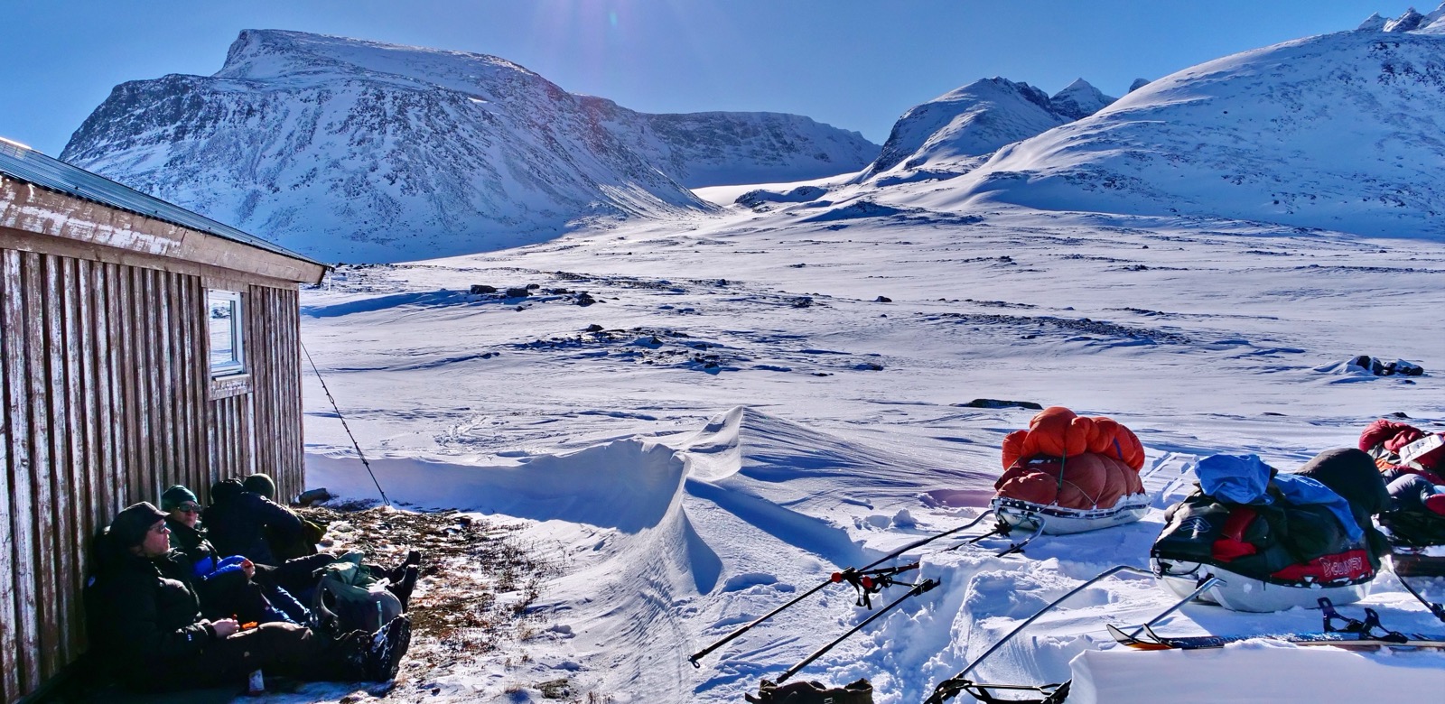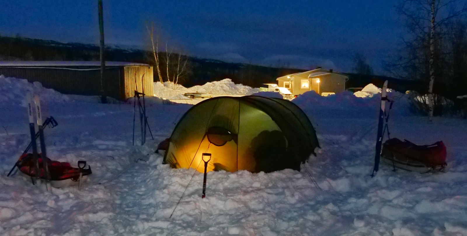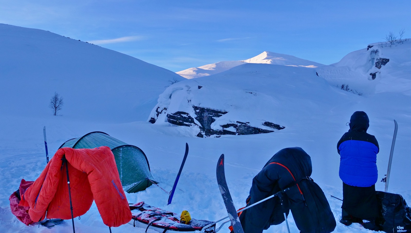 Första ankomsten till Ritsem och vår tältnatt utanför fjällstationen för att invänta samtliga deltagare gav mig en förväntansfull känsla. Att prova skidorna lite kort under dagen i björkskogen kring stationen fick mig direkt att reflektera över att detta är inte mitt naturliga element. Det slog mig att här prova något för första gången och veta att inom de närmaste dagarna ska jag "leva" på dessa skidor kommer bli mitt livs utmaning och kommer bli stentufft, SÅ NU ÄR DET ALLVAR. En ny situation som jag verkligen inte har erfarenhet av. När Daniel, Ulfsson och jag lägger oss i tältet utanför stationen så kan jag inte annat än att skratta högt! Hela situationen är ganska absurd. Det går upp för mig att allt i den här situation är nytt för mig när jag ligger där i sovsäcken i minus 20 grader Celsius och tänker imorgon gäller det!