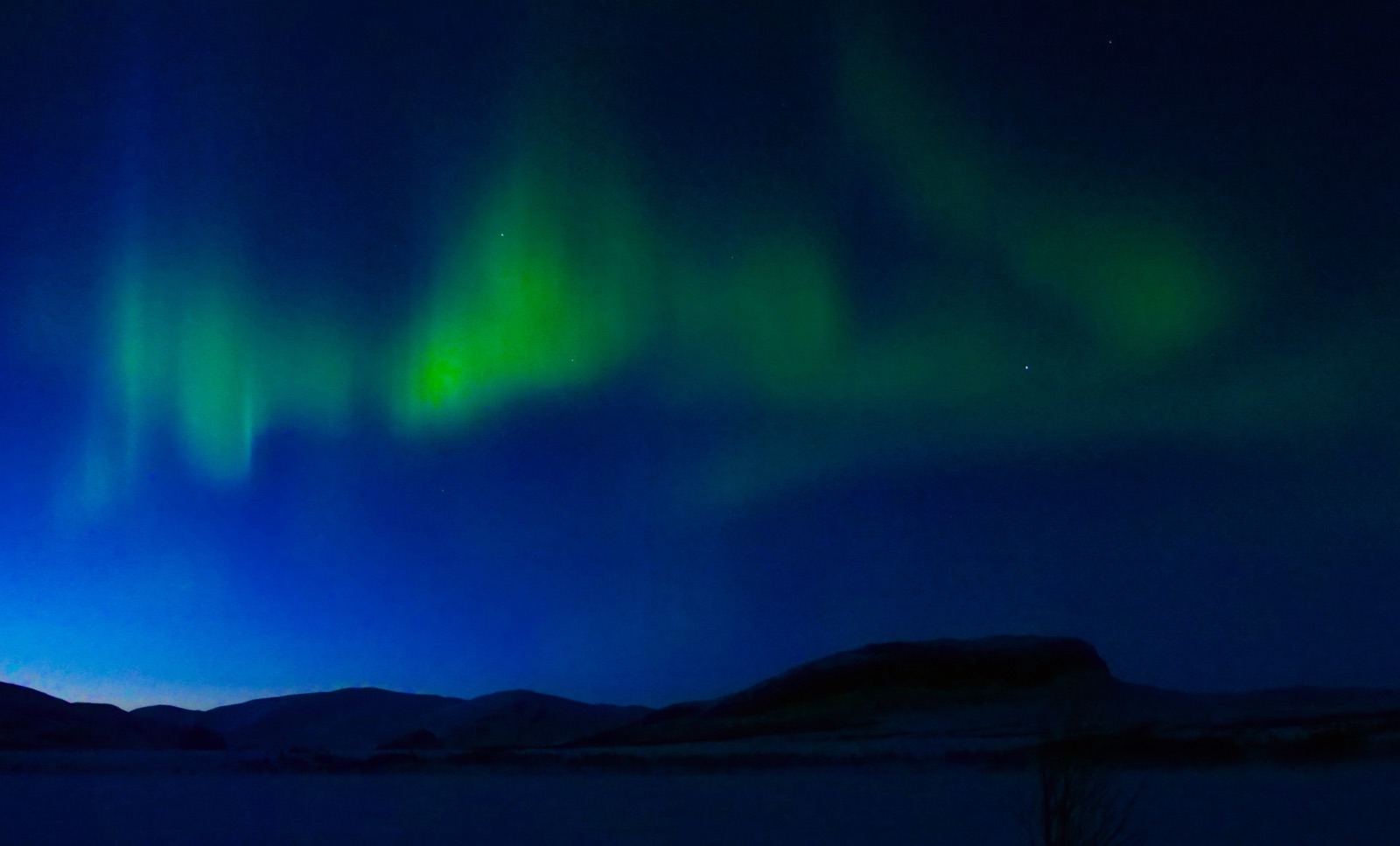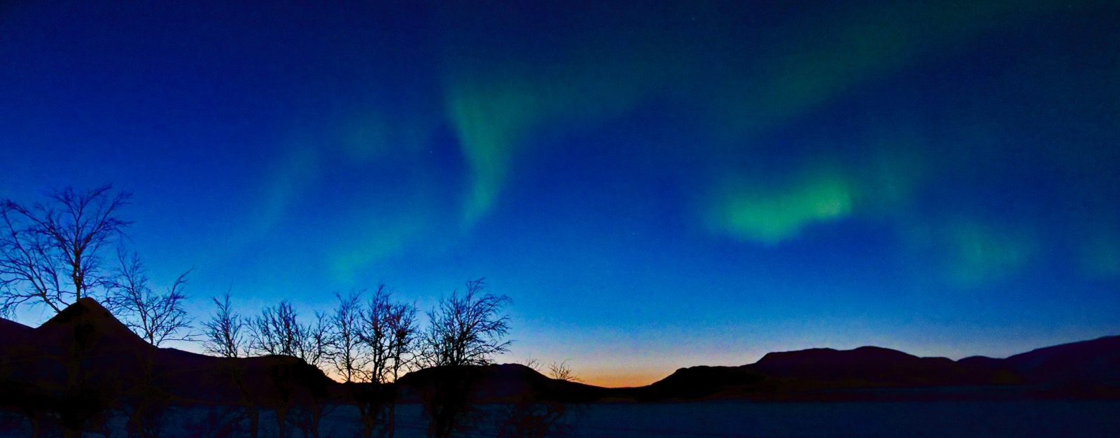 Sjunde dagen och sista natten ute, vi börjar på allvar se ett slut och allt mer tala om hur gott det ska bli att komma till Salto och få ta en öl och bastun. Men vi skidar ut ur det mäktiga landskapet och håller camp på en udde. Det kommer visa sig bli en spektakulär avslutning den sista natten. Temperaturen sjunker till det lägsta vi känt under veckan och när termometern bottnar på -30C och inte går lägre så inser vi att den klara stjärnhimlen har del i detta. Sen börjar något fantastiskt utspelas rakt över oss på himlavalvet. Det är som att man häller en färgburk som rinner och vrider sig i olika mönster ut från ovanifrån och ut till horisonterna åt olika håll samtidigt. Jag hoppar och skuttar i camp min rygg och kylan till trots, och får till och med fram min kamera som inte fått se Sarek alls så mycket som jag hoppats just pga att det hela tiden krävs att man gör något annat. Men nu spenderar vi säkert 20-30 minuter ute att beskåda detta fantastiska norrsken och bara njuta av att detta kom som pricken över I:et på en omväxlande tur i detta förunderliga land.
