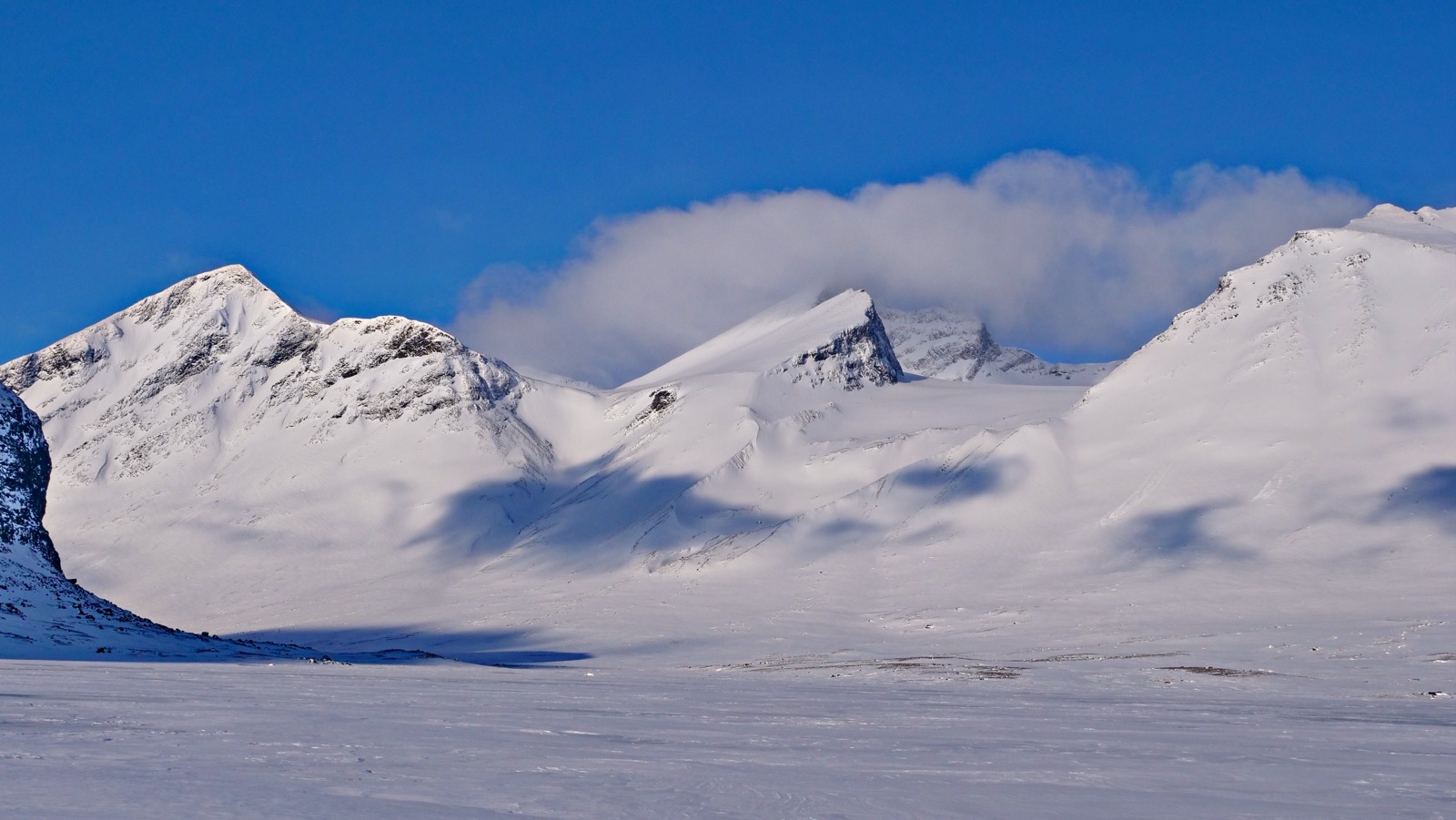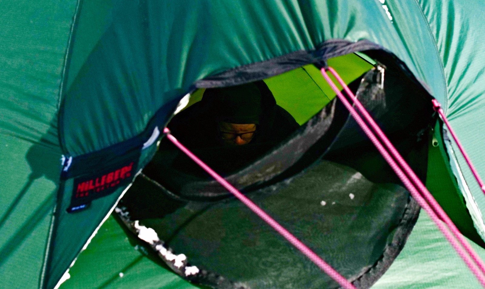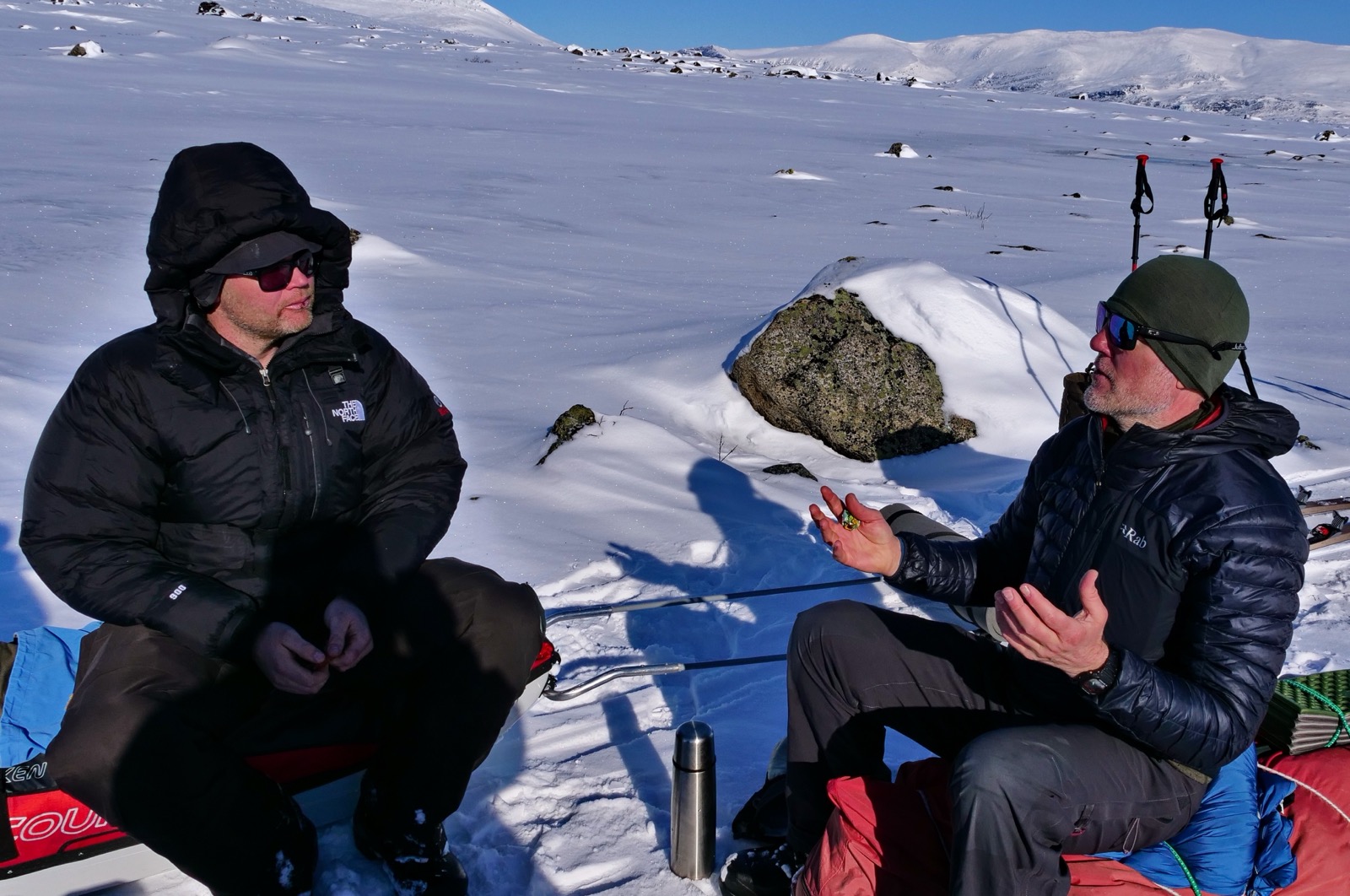 Femte dagen och vi skidar in på sjöarna mellan de höga bergen och i stämningen känns det nästan lite kusligt. "Mordor" dyker upp som en metafor för landskapet och jag tänker att det nästan hade kunnat vara på en annan planet. Vi får svårt att hitta tillräckligt med snö för att sätta camp då det är isigt och kargt landskap som ligger framför oss. Det blir att skida vidare från tilltänkt tältplats för att hitta en snödriva som vi bedömer som god nog att få ner snöankare och gräva en köldgrop i.