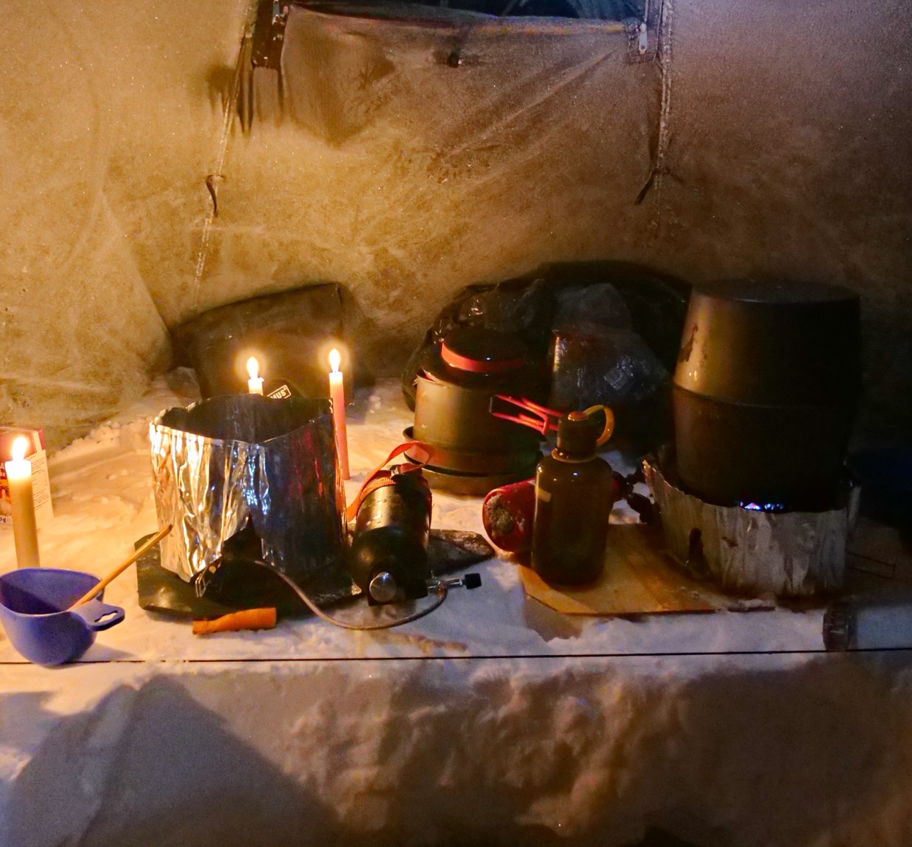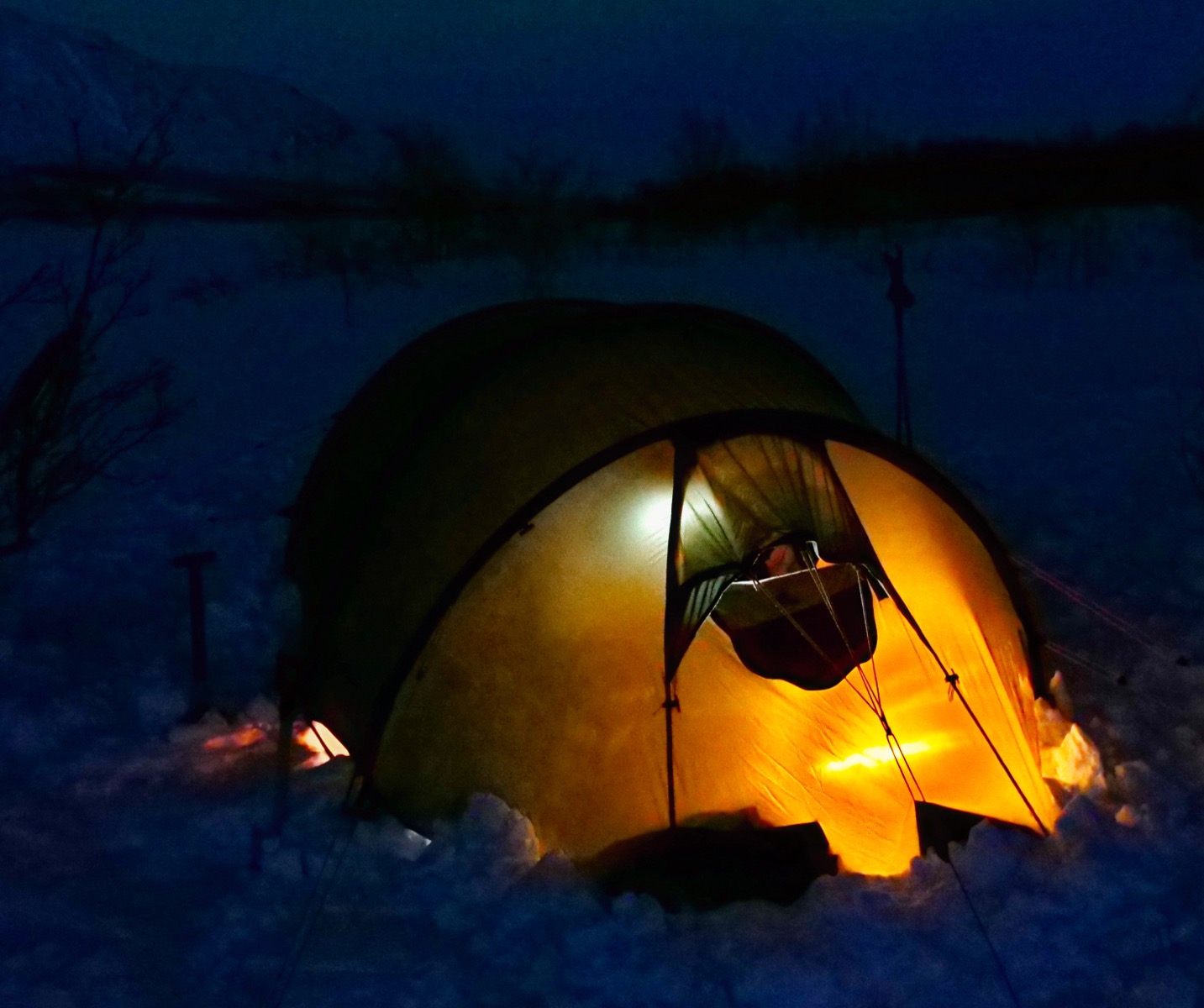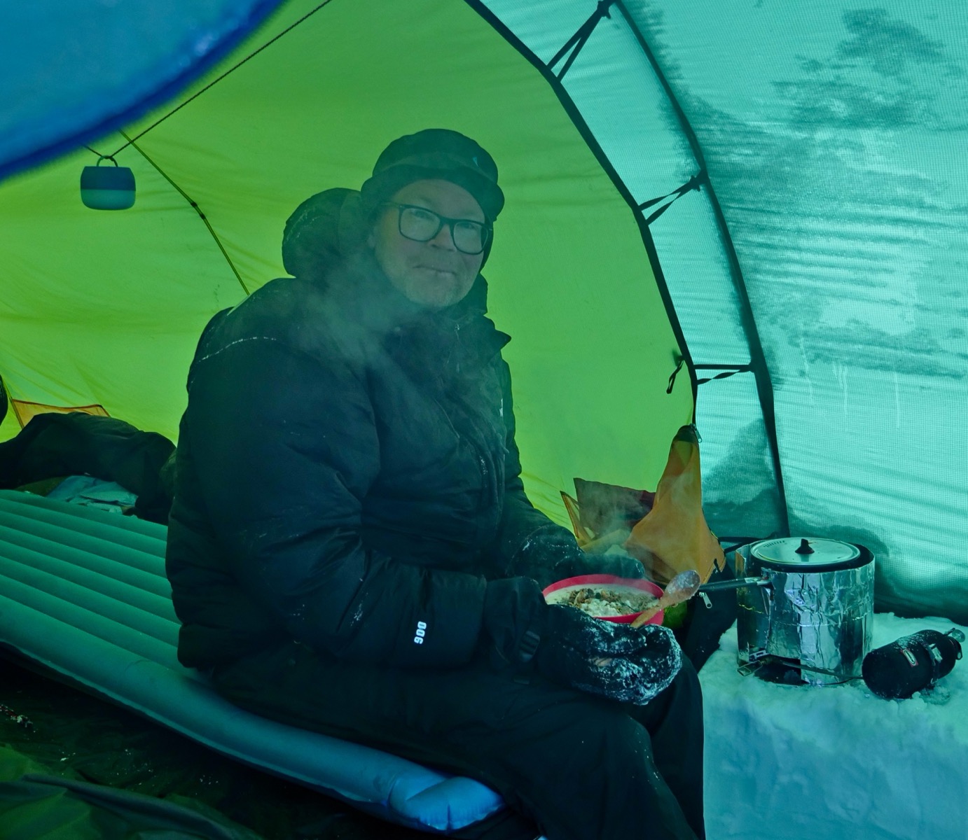Lite allmänt om mina tankar om camp. Jag såg inte framför mig inför denna vintertur hur tufft det skulle vara att hålla till i camp och få det att funka. Till exempel att smälta snö både morgon och kväll till dricksvatten, mat, morgondagens mattermos med blåbärssoppa osv. Det var något nytt för mig att behöva lägga flera timmar både morgon och kväll för att smälta allt vatten som gick åt. Det gällde hela tiden att hålla köket i trim och justera användning av bränsle på rätt sätt. Alla detaljer i det kommer jag inte gå in på men jag kan kort och gott säga att denna delen av turen var mig överväldigande. Rutiner kring att få kökets användning optimerad är primärt för att camp ska fungera bra. Fungerar mat och värme (flaskorna man värmer kläder sovsäck osv.) så har man mycket lättare att frigöra tid för alla andra saker som är tufft nog i sig. Eller att bara byta kläder vid rätt tidpunkt. Eller toabesök. Ja för att över huvud taget kunna komma ut ur tältet och ta lite bilder eller beskåda den underbara himlen som när jag väl hade lite tid gjorde mig helt mållös. Så vackert med stjärnorna! Camp var den stora utmaningen även om jag inte hade det lätt med skidåkningen så krävde det bara ett stort pannben. Men i och kring tältet så är det ett ständigt förberedande av nästa sak som måste upp ur någon säck och användas för att det sedan plockas undan så att man inte har ett totalt pryl kaos.