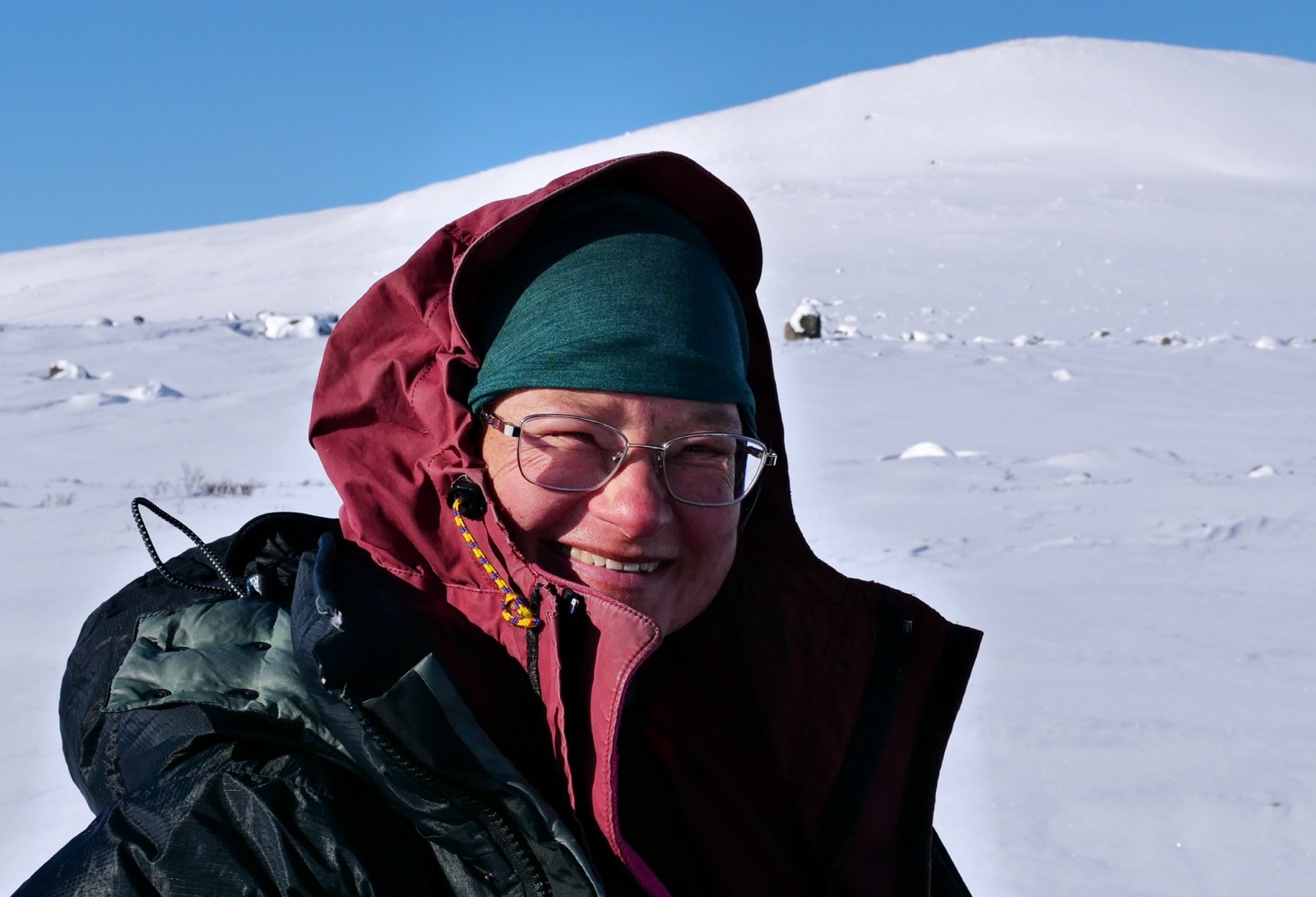 Den fjärde dagen är "whiteout day. Det snöar och vi skidar på i ganska tungt före med djup snö. Mina fötter och händer har börjat få svårt att hålla värmen, lite pga att jag blev dyngsur i pjäxorna andra dagen när vi forcerade pulkorna i uppförsbacken. Då kom det mycket snö i dom och de är som två tegelstenar som är svåra att värma även med Nalgene flaskor i på mornarna. Nu börjar det kännas i fötterna och hälen på ena foten börjar ömma, den har tagit stryk av att pjäxan tar sån tid att bli något varm. När vi letar oss fram mellan kullar och raviner så inser jag hur svårt det är att navigera i det här landskapet. Daniel har mycket erfarenhet och vi tar oss runt på ett bra sätt i dessa svåra förhållanden men vid ett tillfälle där han spårar (skidar först i kön) så missar han ett lågt "drop" på lite drygt en meter och försvinner i snön framför oss. Man kunde verkligen inte se konturen av kanten då allt framför flyter ihop som i en vit dimma. Himlen och snön framför är i samma färg och uppför nedför eller plant är omöjligt att se på håll.