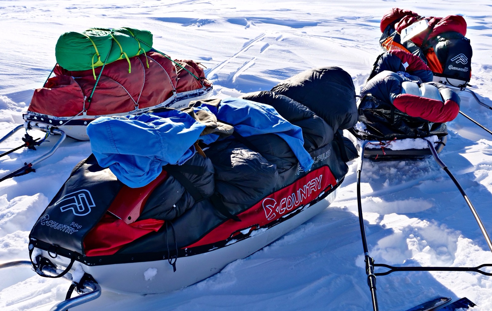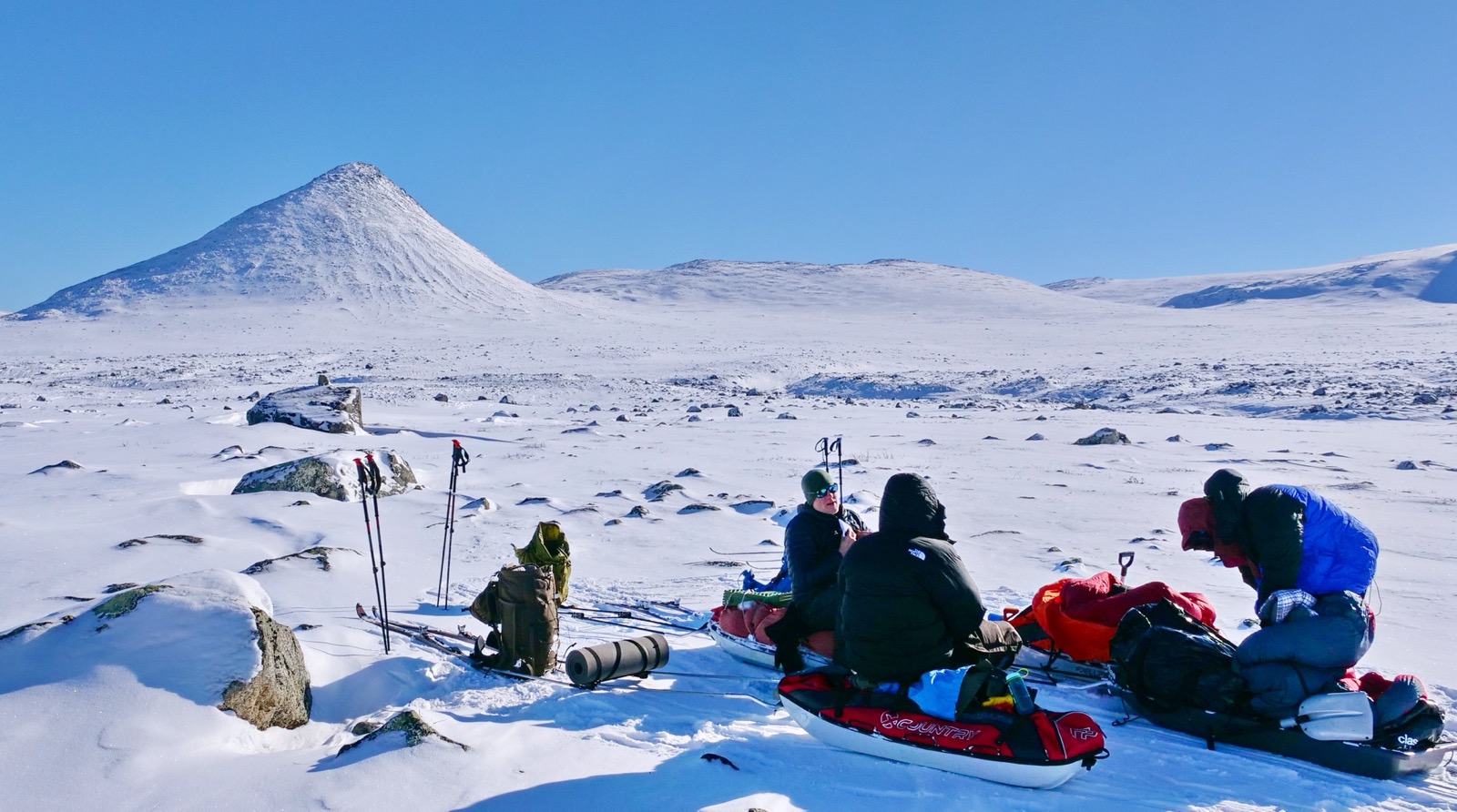 Vi andra trippar fram mot kanten lite sakta och ser hur Daniel vinkar med en skida att allt är ok. Nu är det vår tur att försöka komma ned lite mer graciöst. Åsa tar lite sats men rullar runt och pulkan välter. Min tur och jag tänker nu får det bära eller brista då jag tar några aggressiva stavtag fram över kanten och kastar mig ut och lyckas på något sätt få med pulkan när jag själv landar på skidorna utan att välta. När vi ska bege oss vidare inser vi att en skakel på Åsas pulka lossnat och gått sönder och nu måste vi laga den på något vis. Ulfson plockar fram ett rep och jag en multitool och Daniel sätter igång och börjar binda ihop en tillfällig lösning. Som skulle bli nog bra för att hålla hela turen skulle det visa sig. Jag tänker själv på hur små marginalerna är när man är så långt ute och utrustningen kan gå sönder. Det kan vara förödande. Så att vara förberedd med några reparations grejer och veta hur man ska laga saker kan vara helt avgörande för att komma ur en knipa. Vi tar igen det vi förlorade i kilometer dagen innan och det ser ändå ut som om vi kommer ta oss förbi "point of no return" där det är längre att vända tillbaka än att fortsätta framåt. Minns inte riktigt detta camp då det flyter ihop lite i minnet. Troligen pga att jag nu var påtagligt trött och sliten.