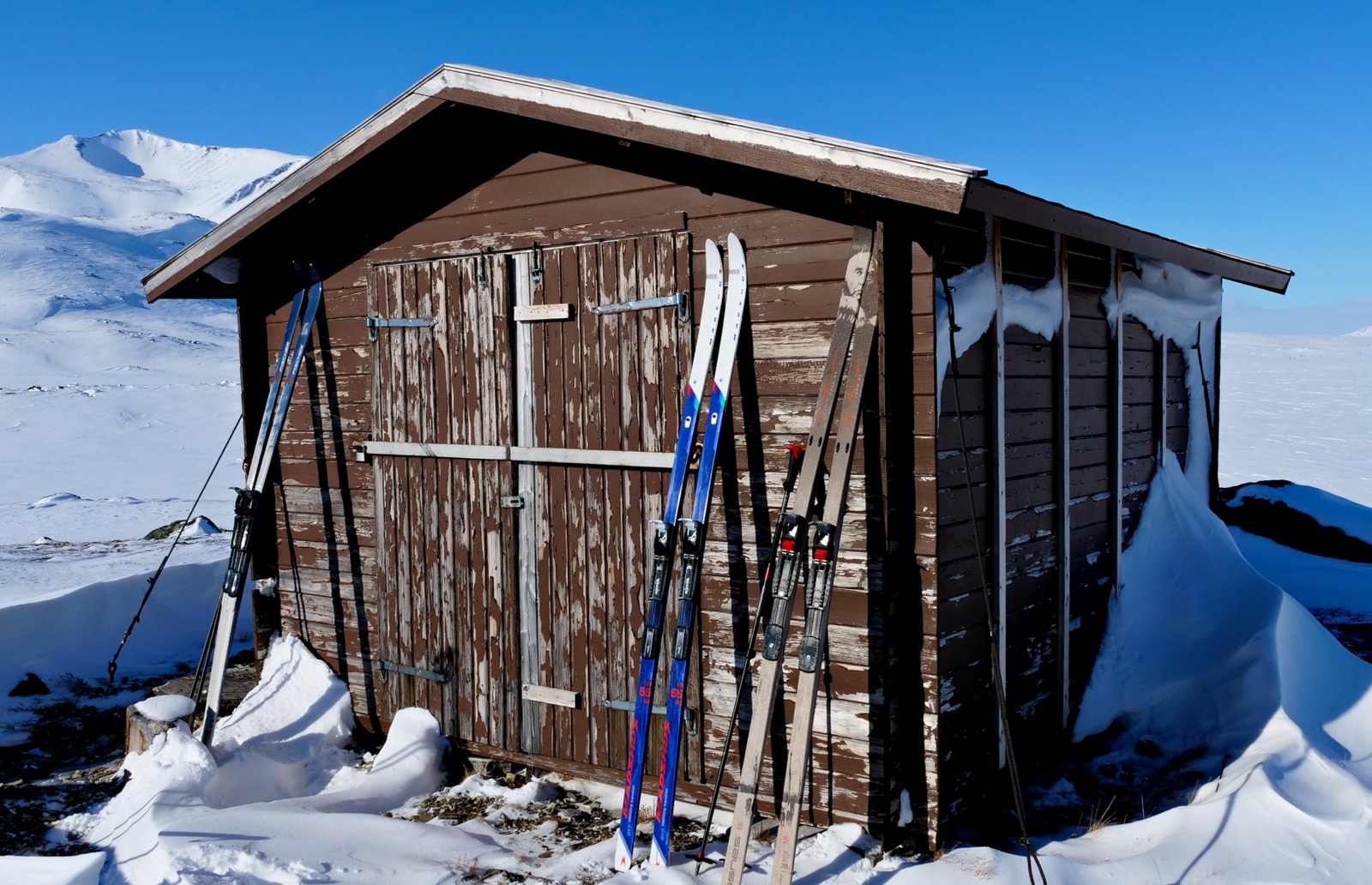 Sjätte dagen och vädret visar sig från sin bästa sida nu är det helt plötsligt vindstilla och soligt. Det känns om om fjället har testat oss nog och nu belönar våra själar med stillhet och fridfullhet. Jag har tyvärr vridit till ryggen när jag varit på toa och får en känsla av att nu kommer jag få kämpa med det för att ta mig ut och komma fram till målet. Med lite Alvedon och Voltaren kräm på ryggen samt en booster medicin av okänt slag som Ulfson gav mig så kommer det ändå att funka. Just när jag skidar så har jag inte så ont men när jag rör mig och vrider hugger det en hel del. Tyvärr förtar det lite av glädjen i dagen som i övrigt är så vacker och fridfull.